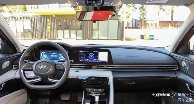 现代伊兰特用上了目前比较流行的连体大屏设计,首先第一眼看上去就会比较精致,突出科技氛围。贯穿式的空调出风口,搭配双色的内饰色彩,很有家用车的温馨简洁质感。但是在用料方面还是多为硬性材质,好在摸起来并没有感觉很廉价。造型独特的皮质运动方向盘比较有亮点,而且搭配10.25英寸的彩色全液晶仪表盘,有着虚拟座舱的感觉。但是仪表盘的动画表现和色彩确实还有待提升,看起来会比较普通。