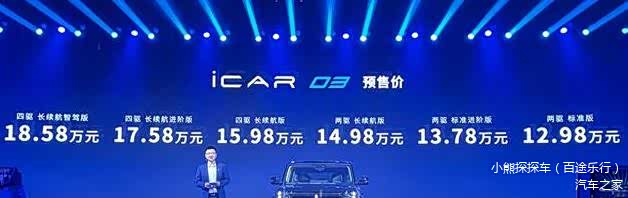 在今年4月份,奇瑞发布了全新的新能源品牌iCAR,在之后的上海车展上,iCAR品牌的首款车型iCAR03也首度亮相,新车定位纯电动硬派风格的SUV。近日,奇瑞发布了这辆全新的iCAR03的预售价格,预售价格区间为12.98-18.58万元。