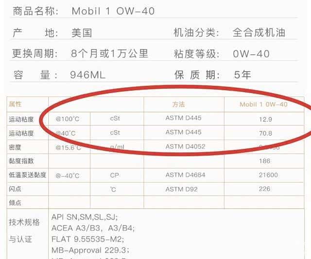 下面是美孚一号的对比,请大家仔细看红圈部分。也就是说,无论是40℃还是100℃,0w40的机油运动粘度都比5w30的要高出不少。