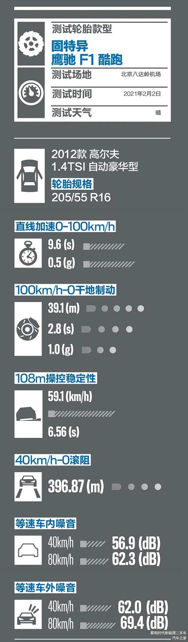 抓地力表现好别忽视了其他性能,从我们的其他测试项目中能够看出,它的噪声和滚阻成绩也都不错,这说明它性能上没有明显短板,是一款特点突出、产品力很高的轮胎。通过鹰驰F1酷跑对这辆老高尔夫焕发青春的驾驶体验,我们觉得这套胎运动的定位是很精准的,而且它的尺寸很大众化,可以匹配众多常见的家轿,这就让更多的消费者在想改装或者提升车辆性能的时候多了一种选择。
