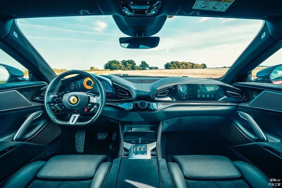 车内的驾驶体验也不像SUV。你自然而然地坐得低得多,看不到汽车的两端,因为前中置发动机使得发动机罩占了更大地方(在较狭窄的B级道路上确实会感觉过宽)。你被牢牢地固定在运动型座椅上,从带有许多按钮的小直径方向盘到中央黄色转速计数器,一切都让你在心理上为驾驶这辆法拉利做好了准备。我不得不说这辆法拉利——是的,这辆高达715马力、0-62英里/小时加速只需3.3秒且最高车速超过194英里/小时的法拉利——并没有预期的那么快。这有两个原因:首先,这款V12发动机缺乏另外两款车型的涡轮增压能力;其次,我上一次体验这款发动机是在812 Competizione上,那是一款更轻更强大的跑车,它的响应非常疯狂,以至于每次踩下油门都会让你的肾上腺素狂飙。