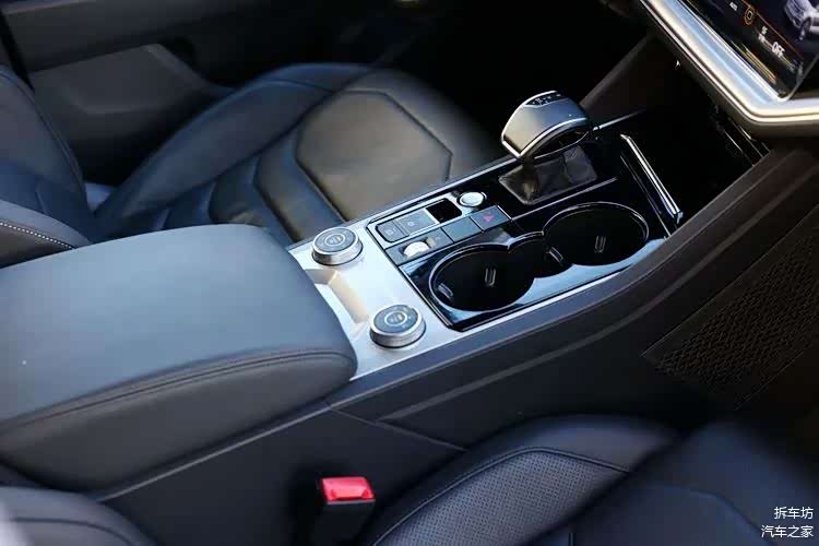 中间平台不算太宽,前端是个储物盒,中间部分是挡把、操作区和双杯座。前排配备USB接口2个,以及手机无线充电。
