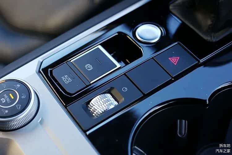 启动键和驻车制动键位于挡把后方,旁边还有个银色的拨轮,用于调节音量——这个设计值得点赞,它比屏上操作或语音操作,方便多了。