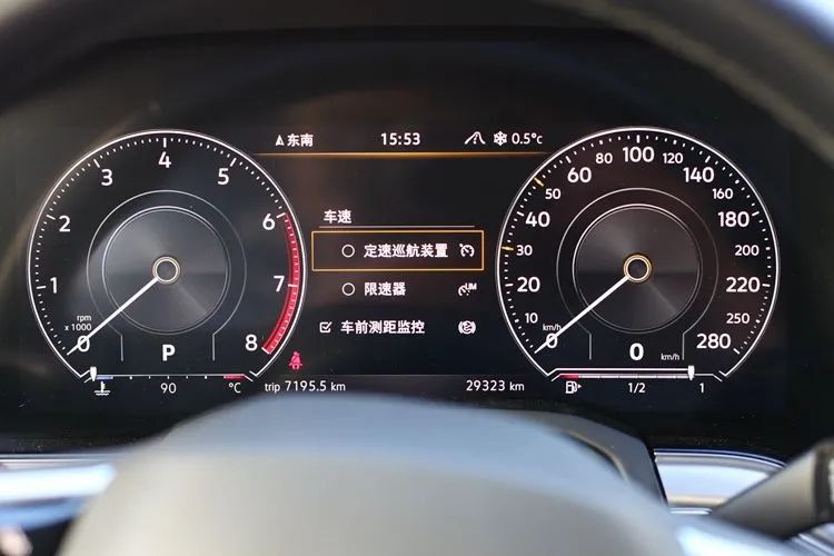仪表盘是一块12英寸的液晶屏,与之搭配的,是投影在前风挡上的抬头显示。仪表盘界面当中的标准模式,是下图所示的这种传统风格——转速表与时速表位居左右,中间是多功能显示区。