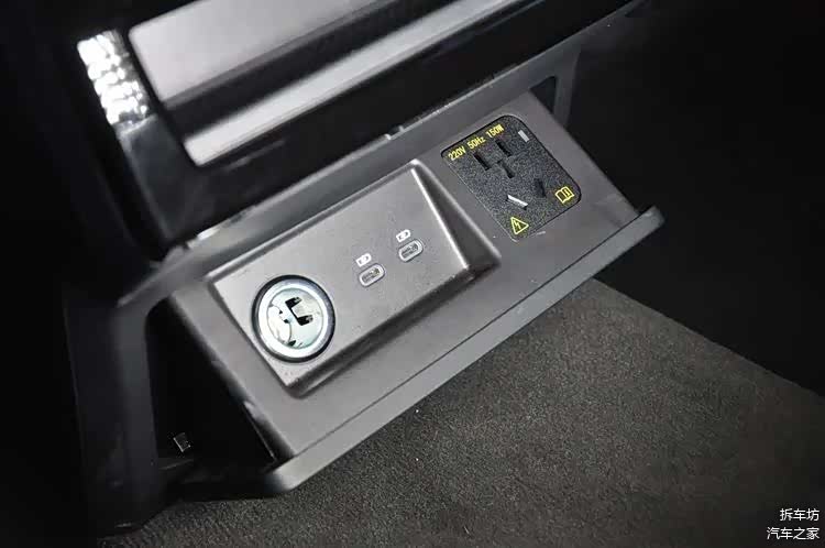 在后排出风口的下面,有个盖板,可以开启,打开后,可以看到上面布置着12伏电源插座、Type-C接口2个,以及220伏电源接口。