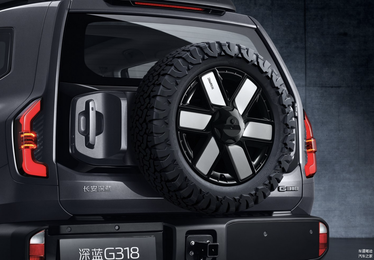 深蓝G318还提供原厂车顶行李架射灯可选,呈现出六边形造型,带来全新科技观感。这不仅在穿越或露营时提供更充足的环境照明,同时在视觉上也更具冲击力。侧面采用隐藏式门把手设计,搭配前后凸起的轮眉线条,突显硬朗风格并提升时尚感。尾部以“太空之门”为主题,通过尾窗玻璃与下方黑色构成主体,两侧体量延申形成托举结构,营造稳定有力的支撑,加上强壮的黑色保险杠,既有辨识度又强壮。