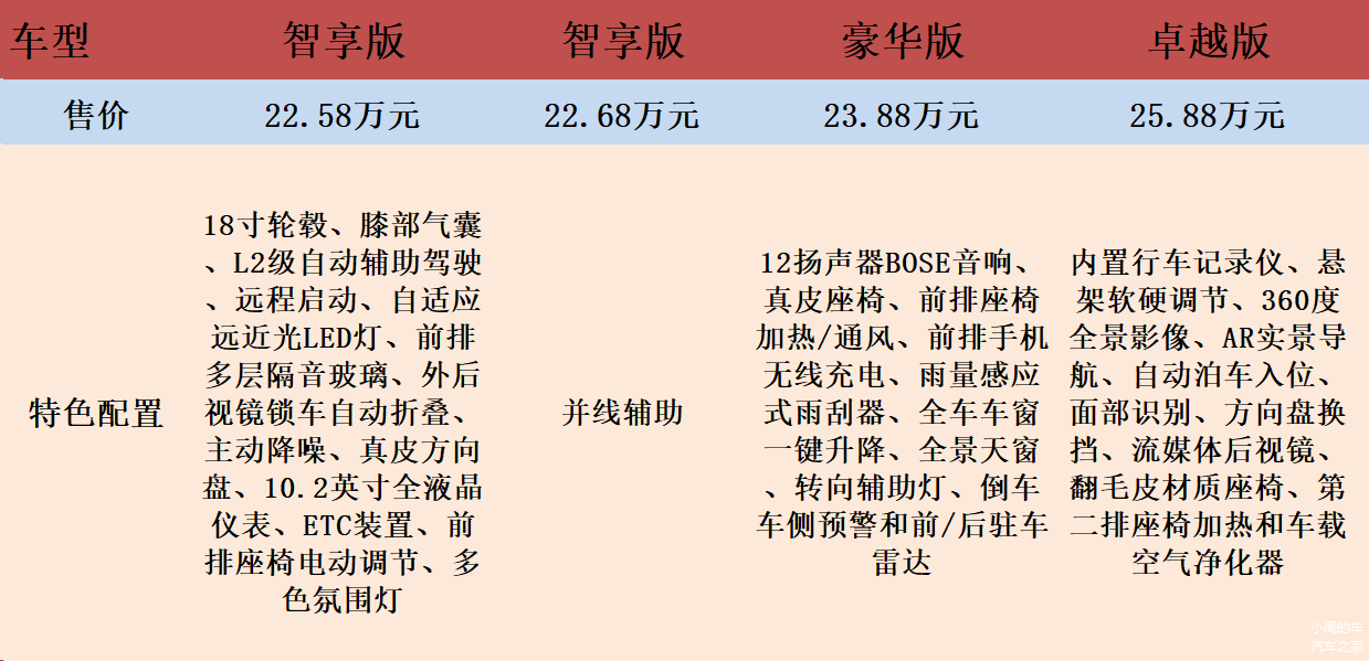 如前文所述,新增加的260TURBO豪华版以及260TUOBO尊贵版车型分别在智享版以及卓越版的基础上贵出了1000元,配置上只是多出了并线辅助功能,对于新手来说还是比较适合的。