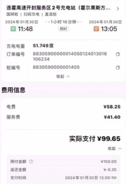 从车主的订单显示,该车主1月30日12点左右在连霍高速的开封服务区进行了持续一个小时十六分钟的充电,最终订单支付金额为99元,总共充电度数为50度左右,换算下来,每度电的价格达到了2块钱左右,确实是非常高。