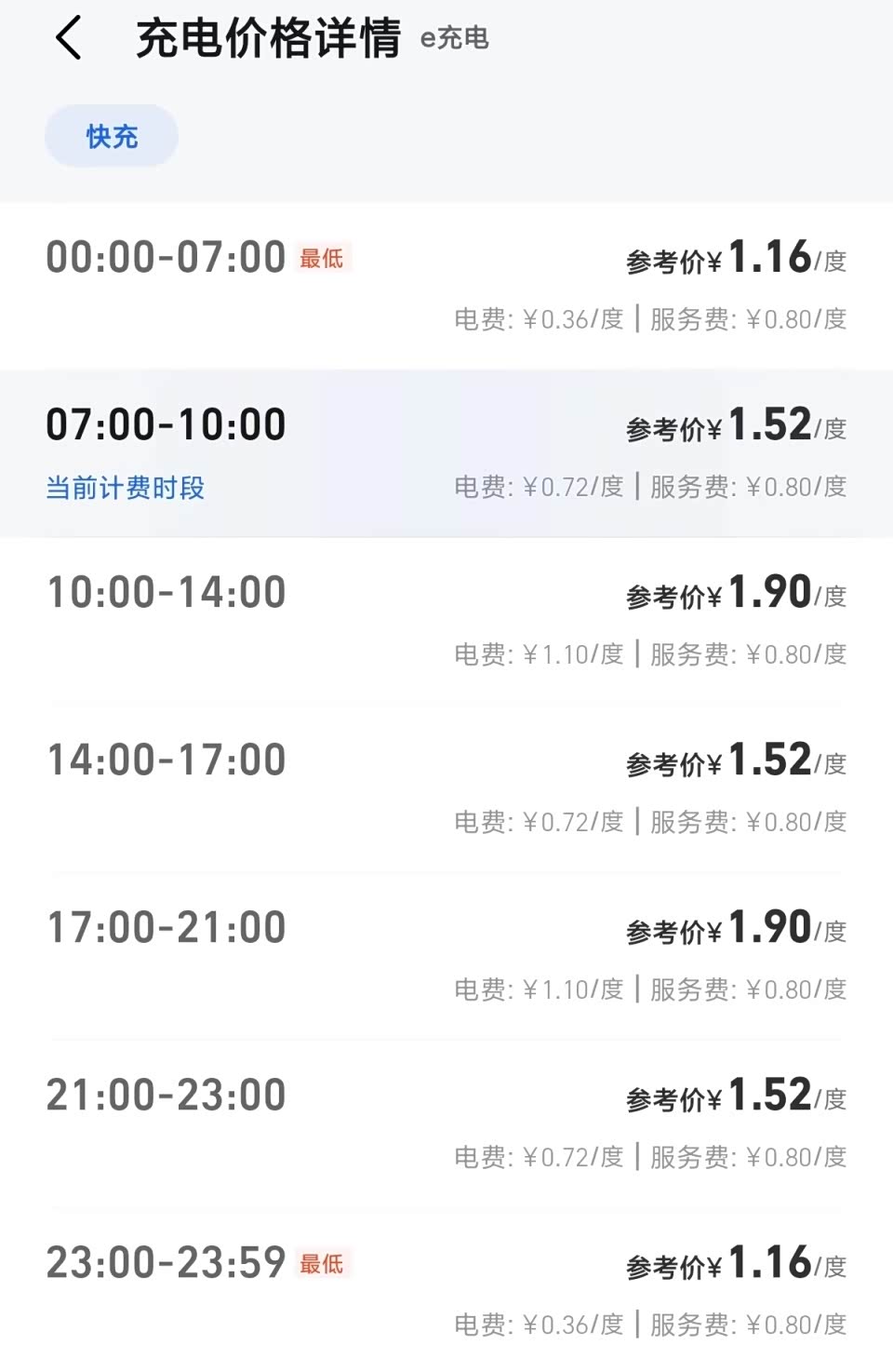 我们就开封服务区的充电桩进行了查询,结果确实是如官方所说,服务费统一0.8元,电费则根据时段分成了三种价格,而前文提到的车主则是在10点-14点这个时间段进行的充电,根据价格显示,该时段是一天中的高峰时期,电价1.9元每度。