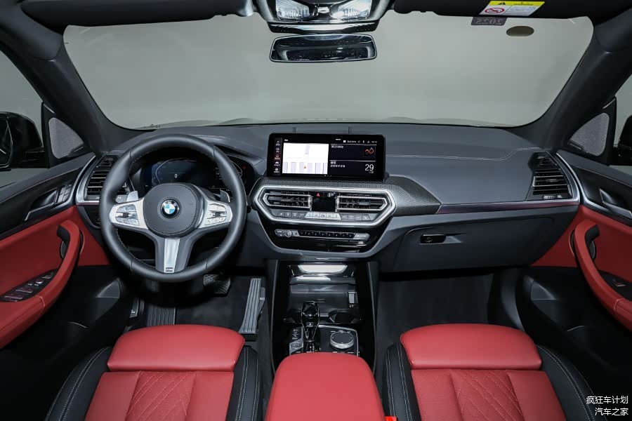 宝马X3整体采用深色铝制菱形内饰,并且使用双色进行搭配,用手触摸按压中控台、座椅、车门内侧等地方,细腻感不错,还有电动全景天窗和11色车内氛围灯,方向盘采用真皮材质,拥有上下+前后调节功能,同时配备了12.3英寸的全液晶仪表盘和12.3英寸的中控屏幕,内置GPS导航系统、导航路况信息展示、道路救援服务、蓝牙/车载电话、手机互联映射、车联网、OTA升级等功能,还有手机APP远程控制系统,可以实现车辆监控、远程控制、服务预约等功能。