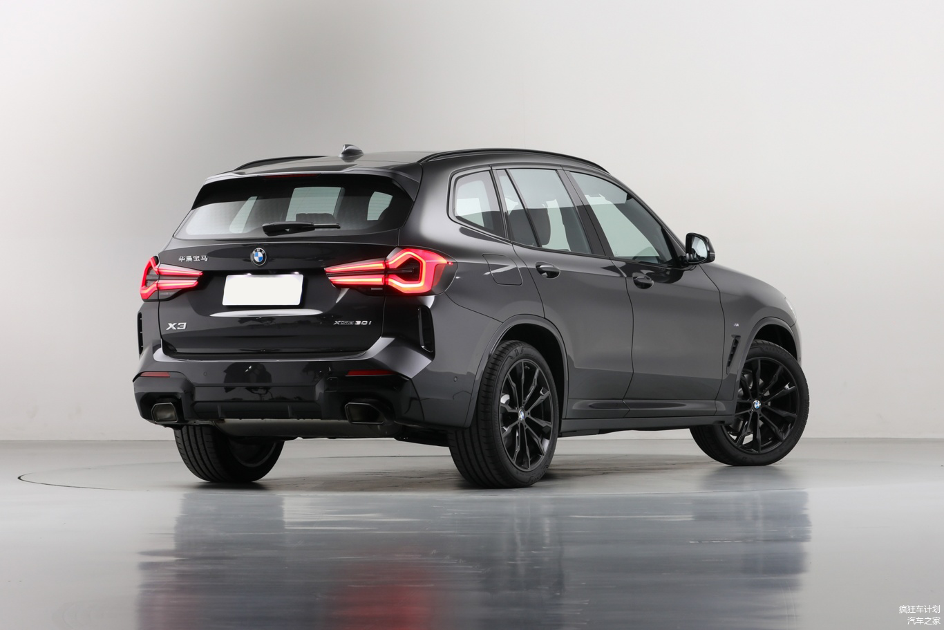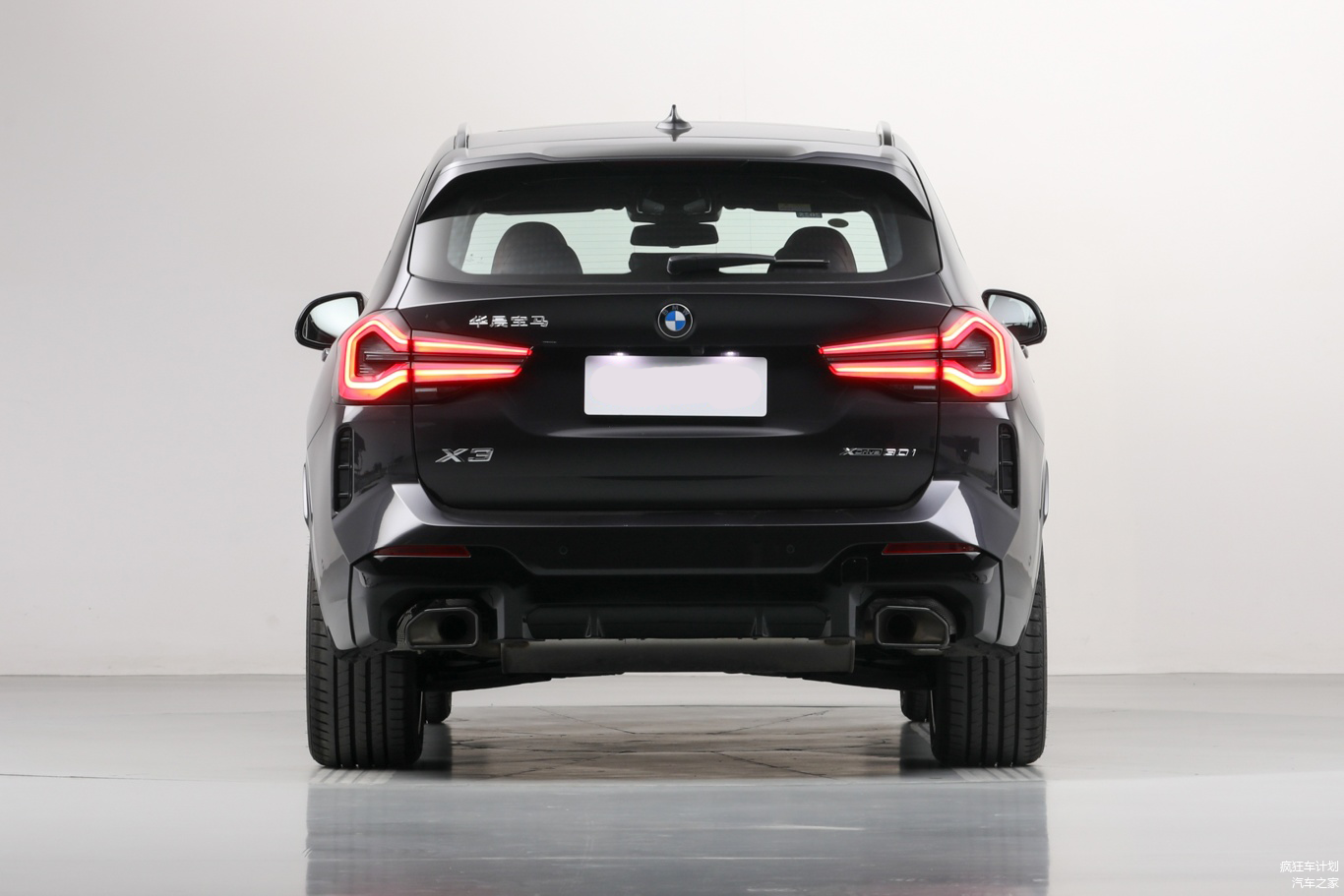 宝马×3尾部造型饱满,显得硬朗,两侧采用类似于C字型的尾灯组设计,内部做了黑化处理,夜间点亮视觉感不错,下部则采用两边共双出的排气布局。不得不说,宝马X3在外观方面确实要更加运动。