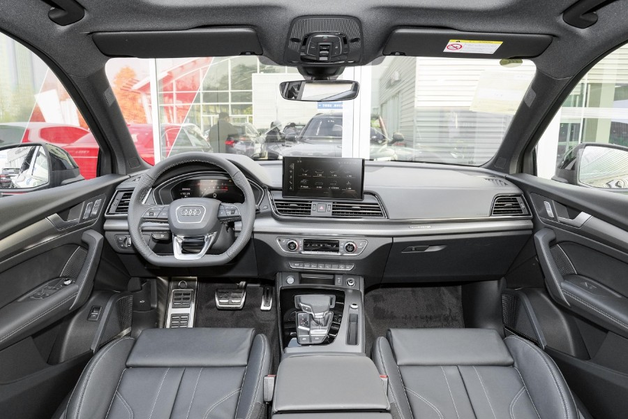 坐进到车里,相信屏幕前很多人都不太喜欢奥迪Q5L的内饰,对比奔驰GLC和宝马X3的内饰,奥迪Q5L的内饰欠缺豪华感,而且纯黑色的内饰略显沉闷。但是接触到实车,你会发现奥迪Q5L的内饰用料挺不错的,软质材料的覆盖面比较大,中控台上的银色饰板表面印刻有“quattro”标识,中控区域的物理按键按下去有清脆的回馈声音,这是奔驰GLC和宝马X3所没有的。