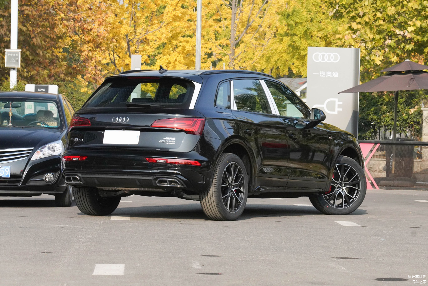 车尾部分,奥迪Q5L继续使用了三角造型尾灯组,并且后挡风玻璃上方还加入了扰流板+高位刹车灯。此外,后包围底部还加入了熏黑装饰件+双边共四出镀铬装饰性排气罩,在运动感方面做得还是比较到位的。