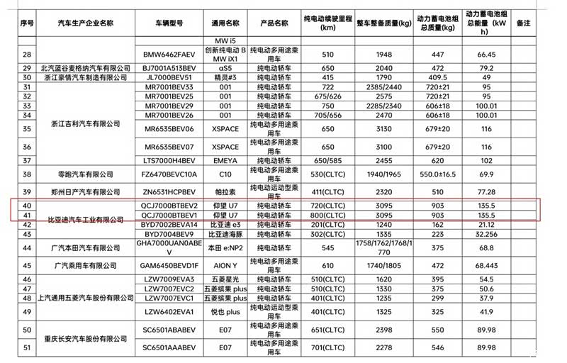 反观比亚迪,由于比亚迪旗下几乎所有车型全部都采用磷酸铁锂刀片电池,因此能量密度受限,仰望U7电池包能量密度约150Wh/kg,基本是比亚迪磷酸铁锂刀片电池的最高水平了,但也与三元锂电池有差距。而一旦电池组过大,车重无法得到合理的控制,对于仰望这类高端车型必然有影响。