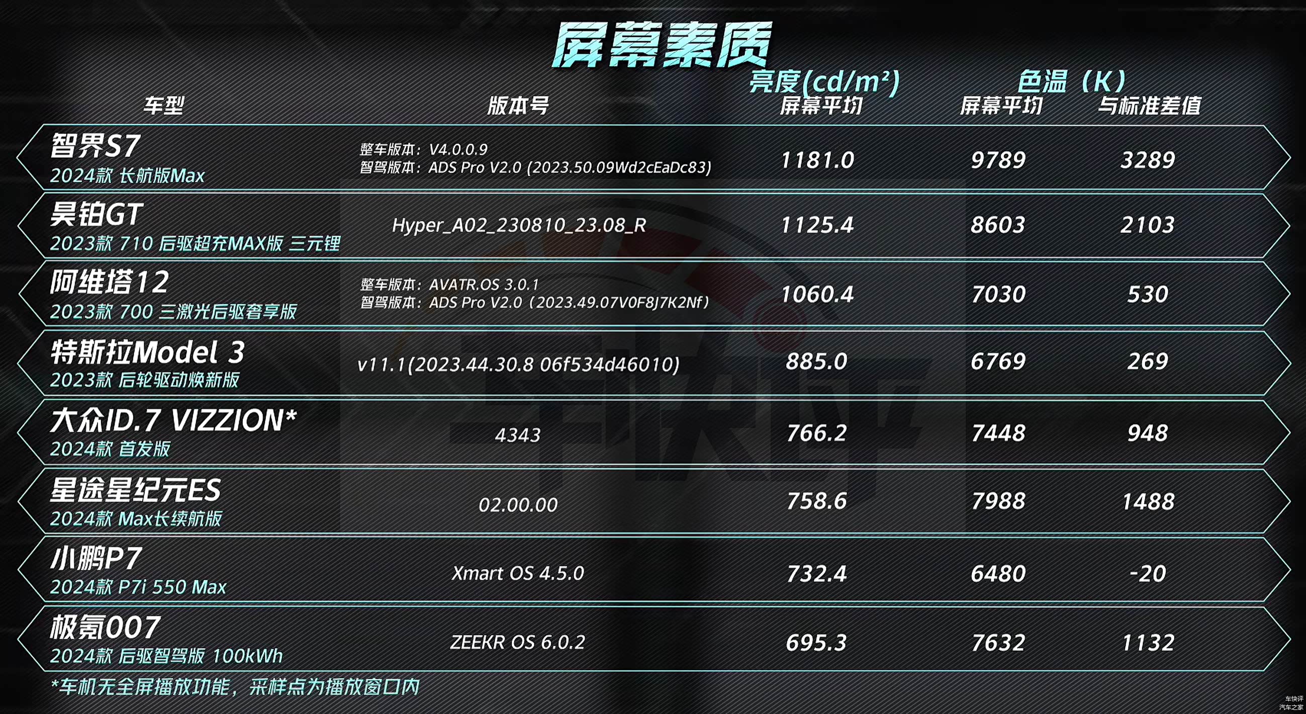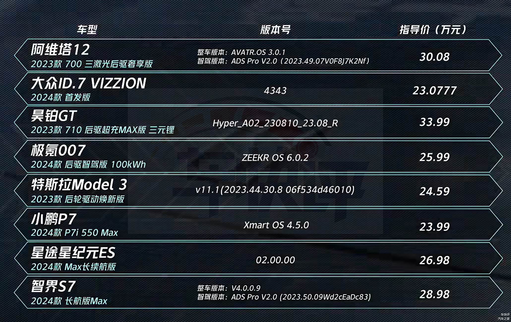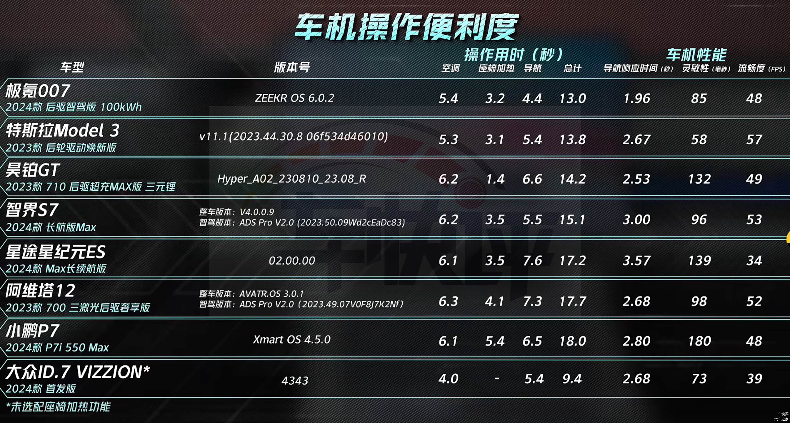 参与测试的车型共有8款,分别是特斯拉Model 3、阿维塔12、小鹏P7、昊铂GT、智界S7、星途星纪元ES、极氪007和大众ID.7 VIZZION。上述几款车都是目前国内售价20万元以上纯电动的市场关注度比较高的车型,其中售价最便宜的是大众ID.7 VIZZION,官方指导价23.0777万元。售价最高的是昊铂GT,官方指导价33.99万元。