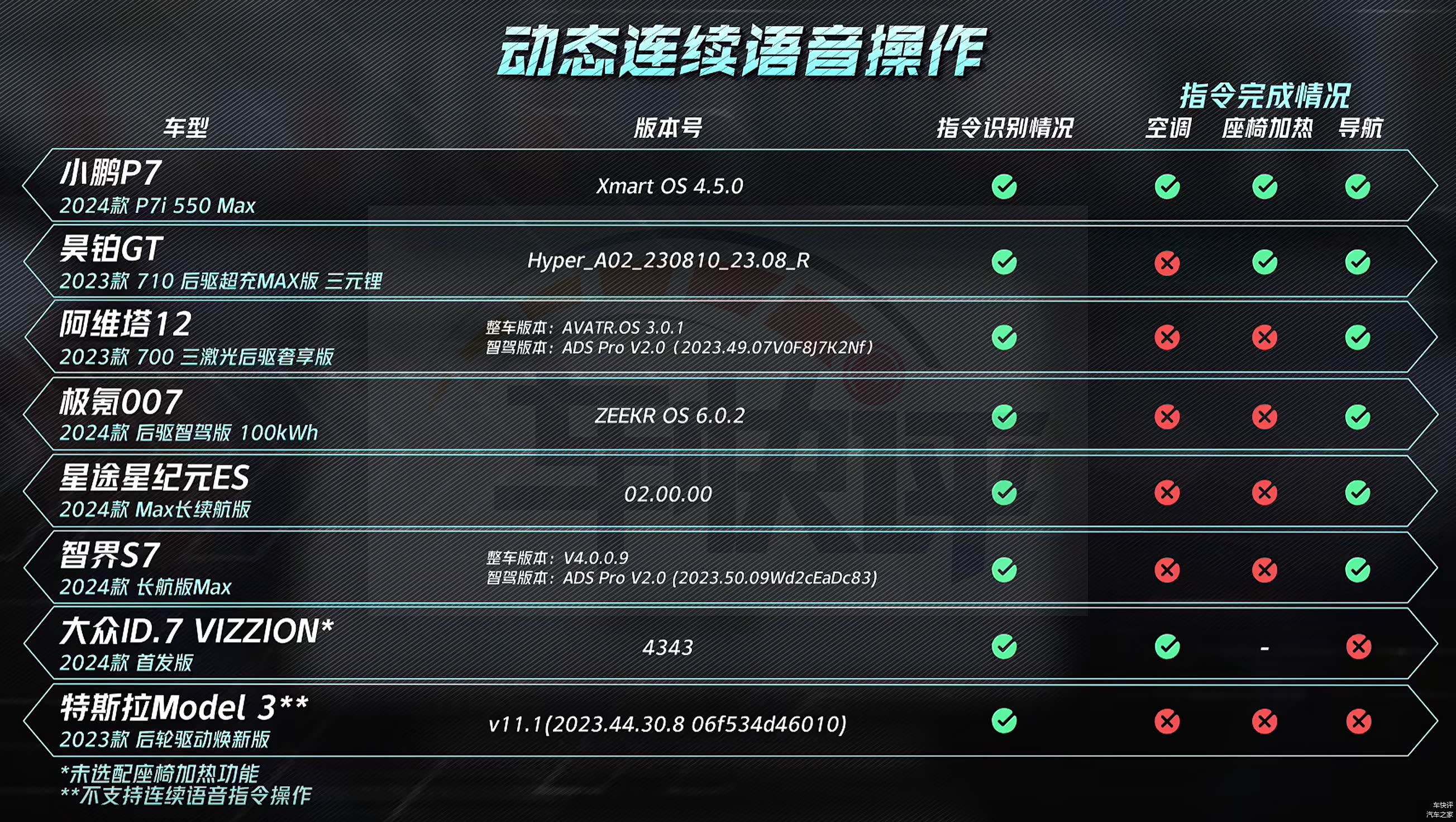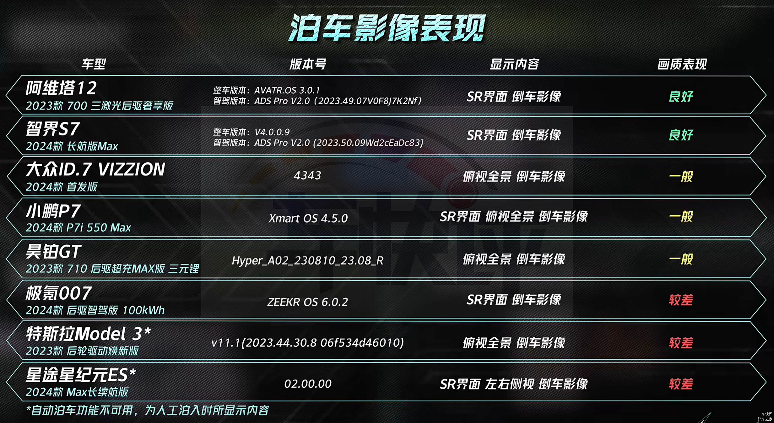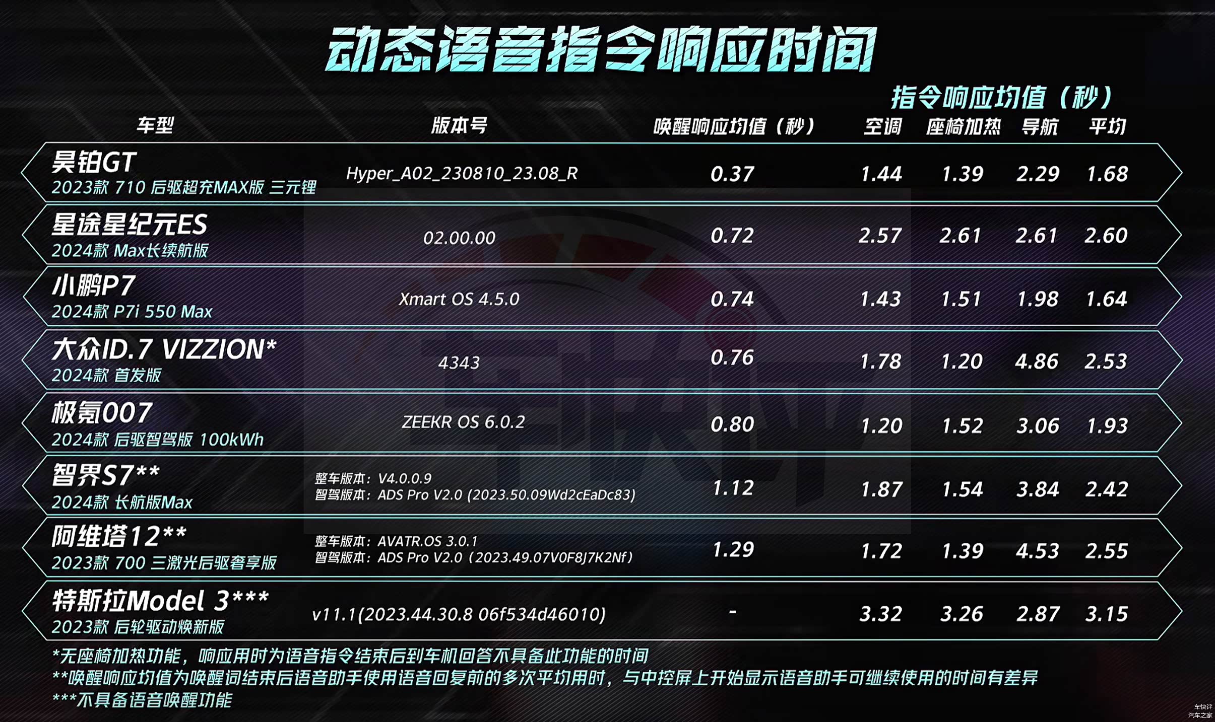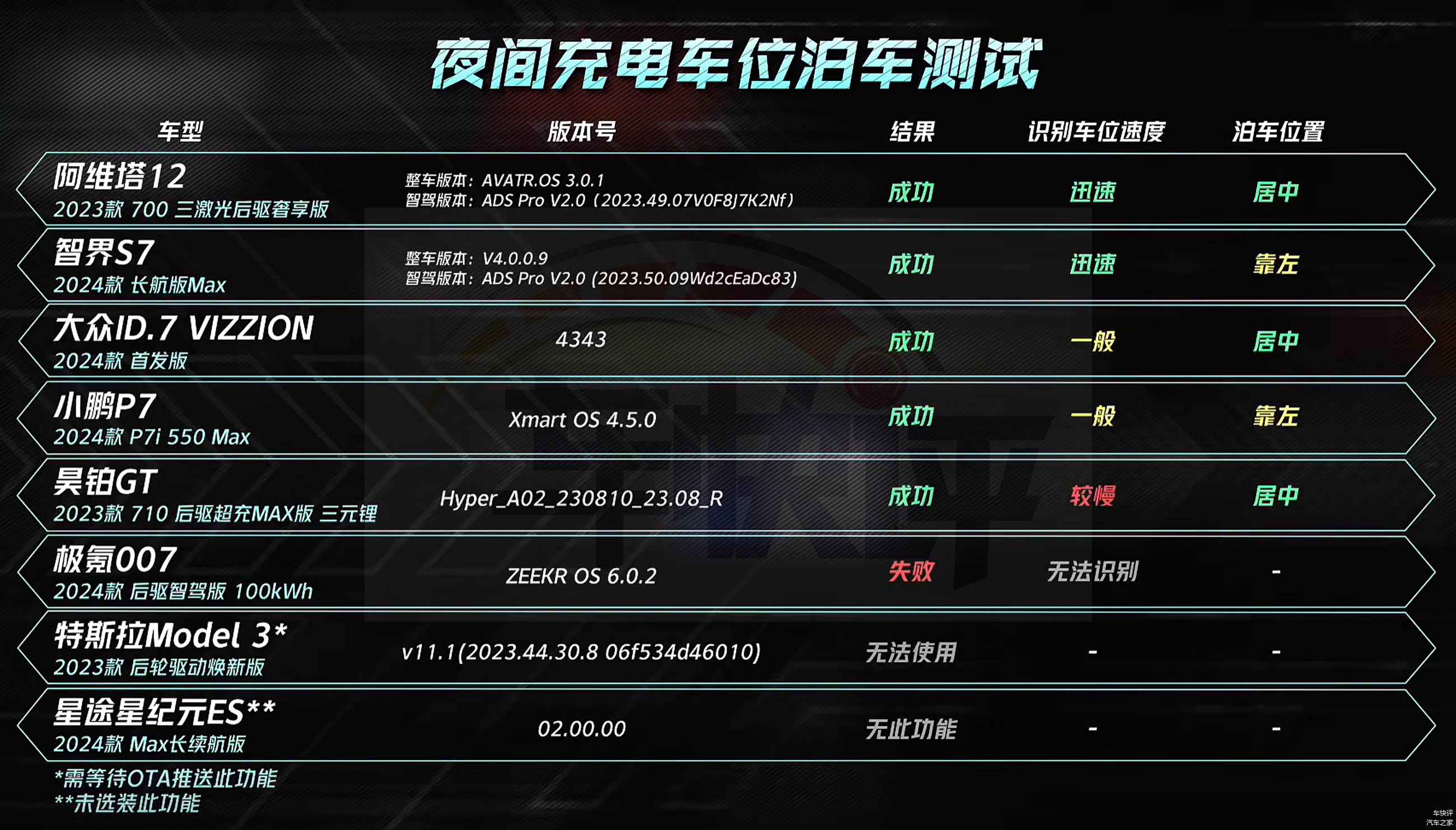 参与测试的车型共有8款,分别是特斯拉Model 3、阿维塔12、小鹏P7、昊铂GT、智界S7、星途星纪元ES、极氪007和大众ID.7 VIZZION。上述几款车都是目前国内售价20万元以上纯电动的市场关注度比较高的车型,其中售价最便宜的是大众ID.7 VIZZION,官方指导价23.0777万元。售价最高的是昊铂GT,官方指导价33.99万元。