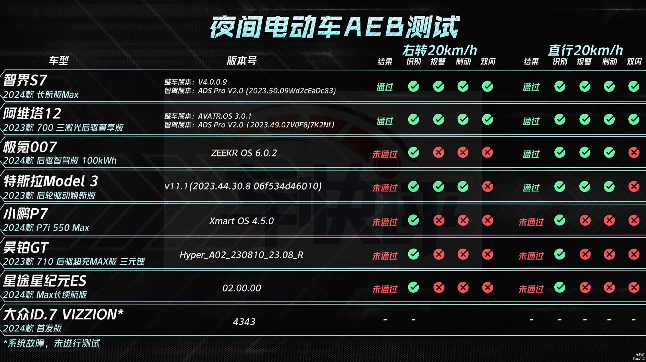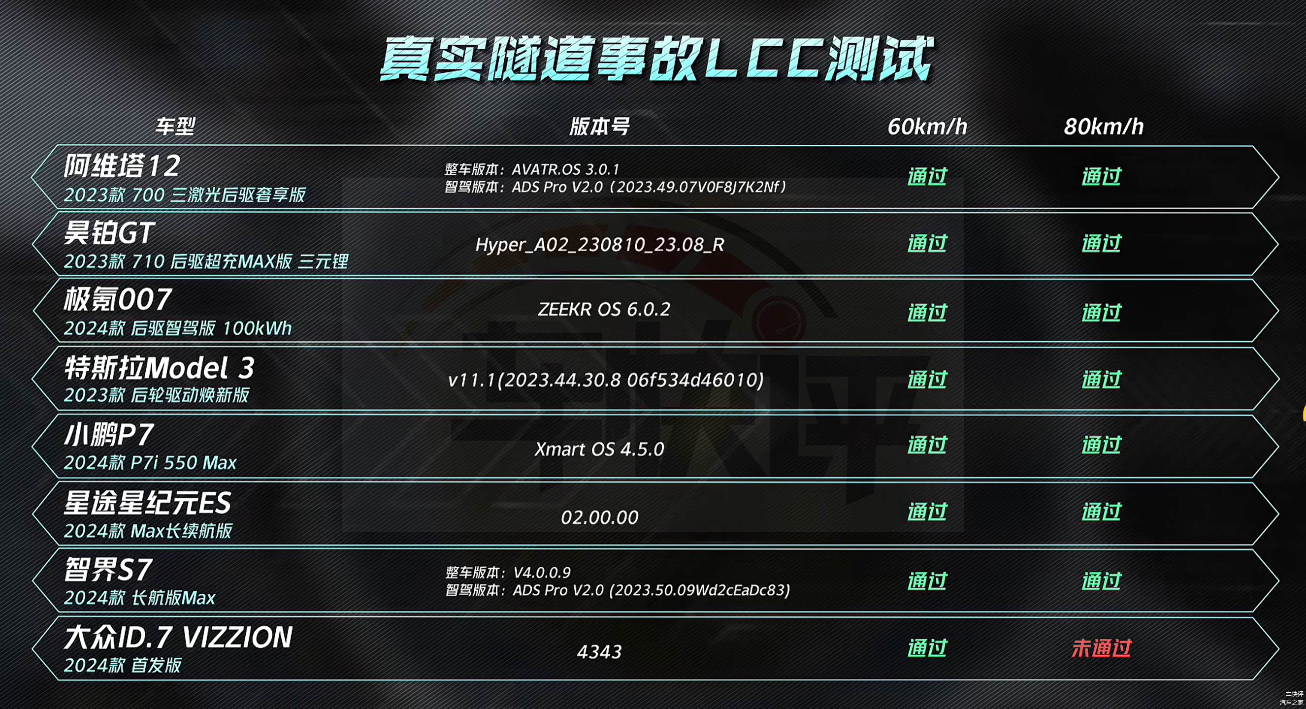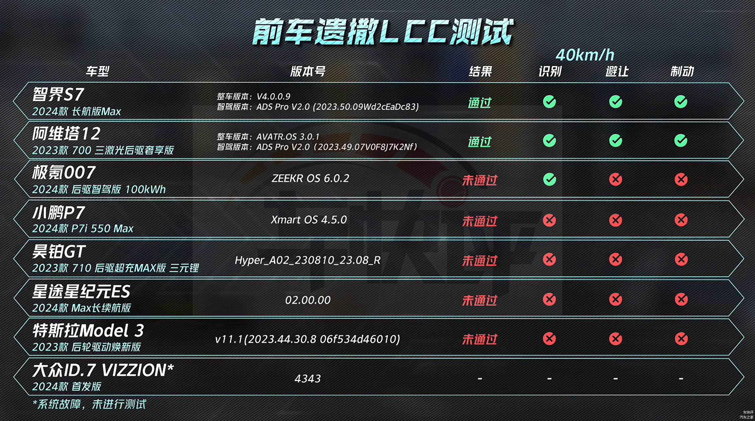 还有在前车遗散LCC测试和夜间电动车AEB测试中,同样也只有智界S7和阿维塔12两款车型能够顺利通过,遥遥领先其他竞品车型。