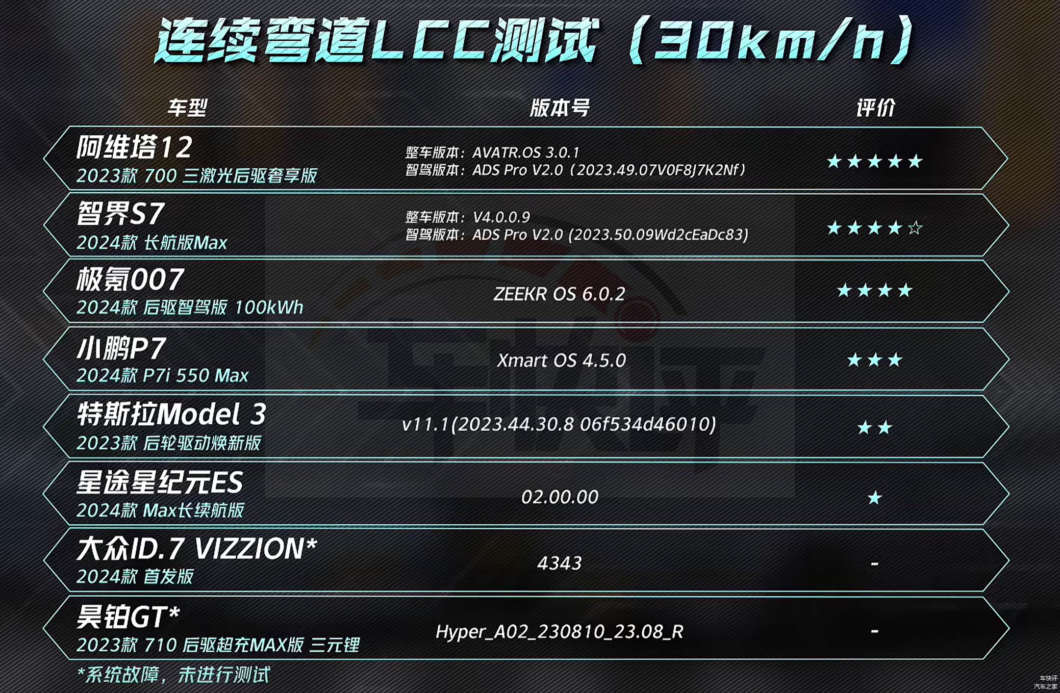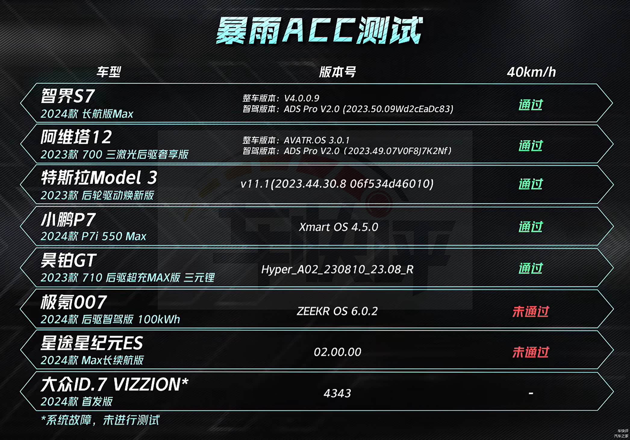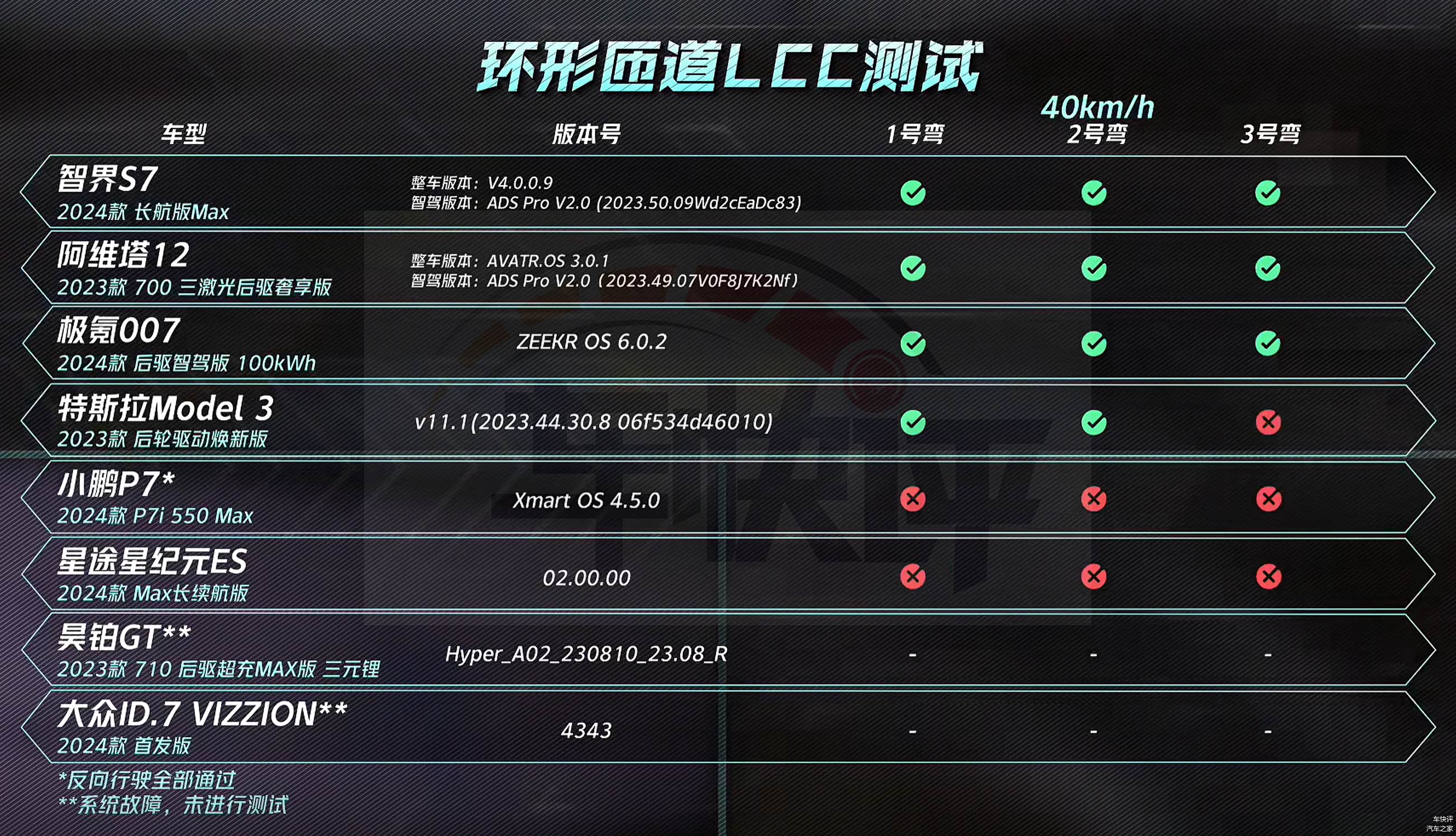 还有在前车遗散LCC测试和夜间电动车AEB测试中,同样也只有智界S7和阿维塔12两款车型能够顺利通过,遥遥领先其他竞品车型。