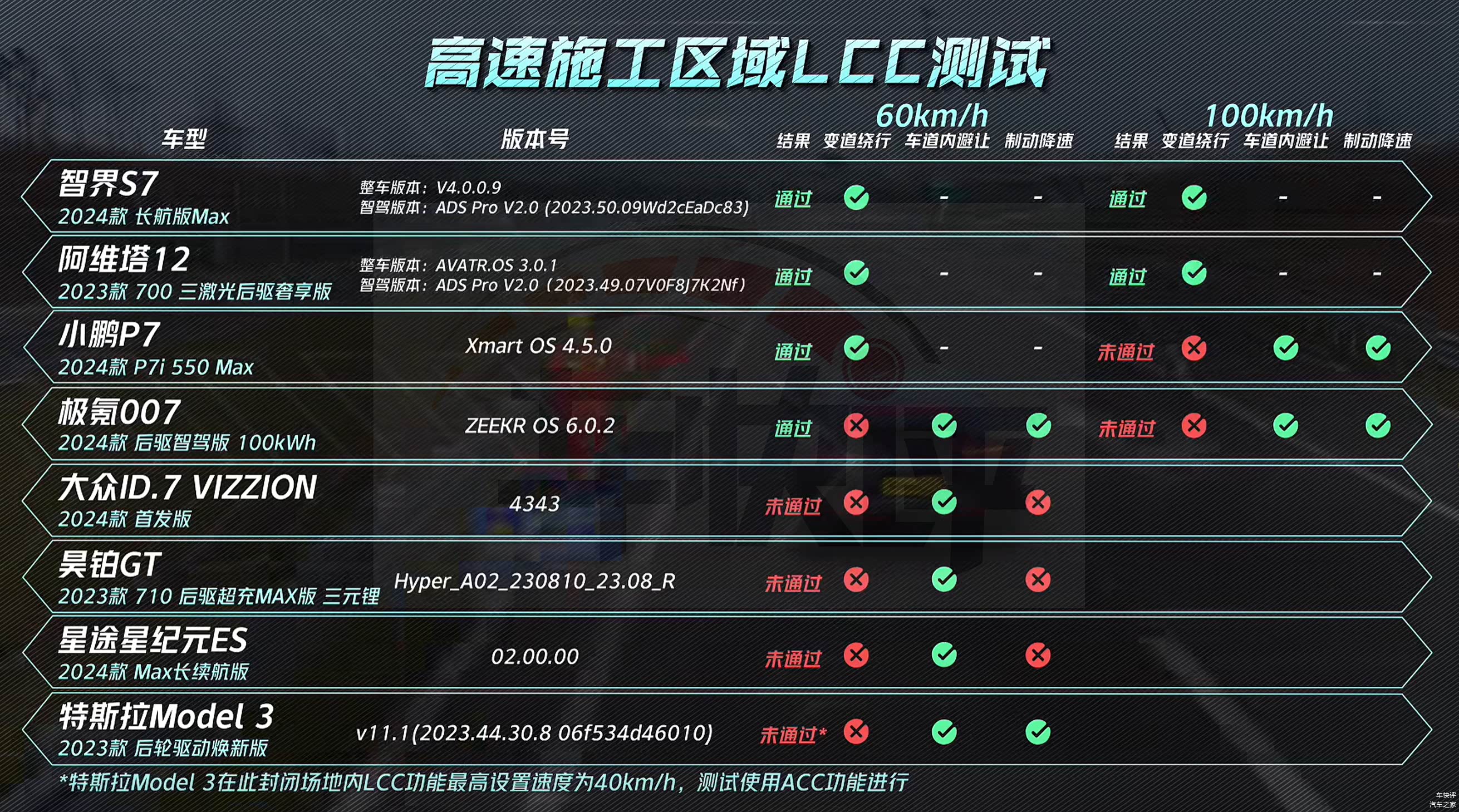 从整个测试的结果来看,由华为赋能的智界S7和阿维塔12表现相当出色。在高速施工区域LCC测试中,能够以100km/h的时速变道绕行,其余车型要么不通过,要么只能做到避让或者制动降速。