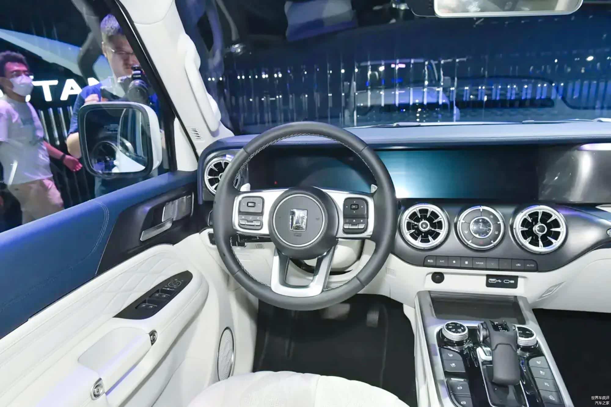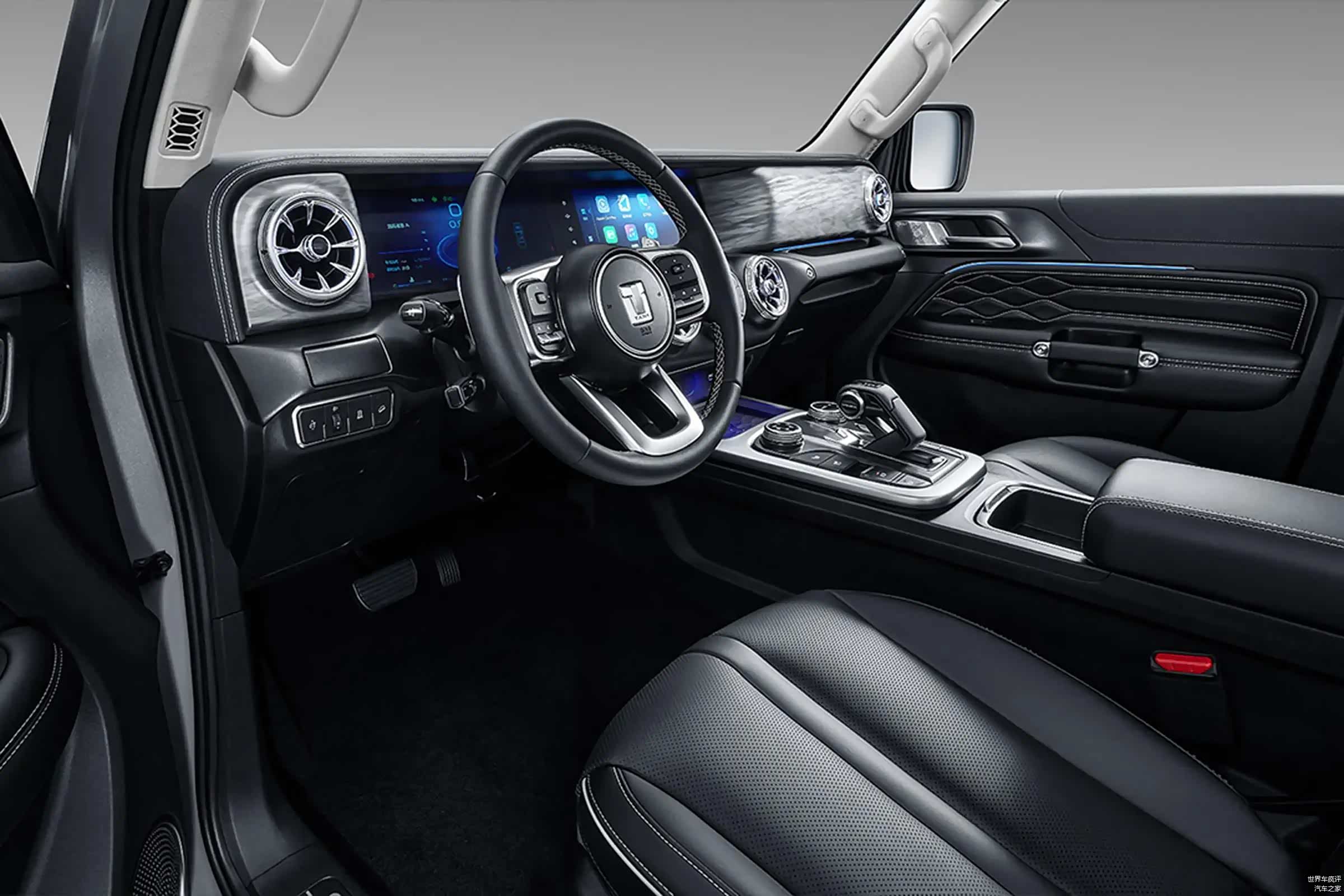 进入坦克300 Hi4-T的车内,将会和燃油版的布局保持一致,车内采用了大量带纹路的饰板装饰以及厚实的皮质包裹,高档感体现的很不错,涡轮式的空调出风口也提升了一定的运动感,同时在中控台部分你也能看到大量的物理按键,操作起来还是非常方便的,挡把的样式也充满了战斗感,当你在越野时肯定也会更加有动力,驾控乐趣更高。中控配备的是一块内嵌式的双联屏,操作的功能性也是比较强大的,语音识别控制、手机App远程控制等实用功能都将配备。