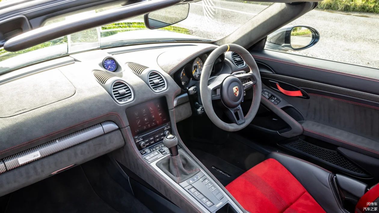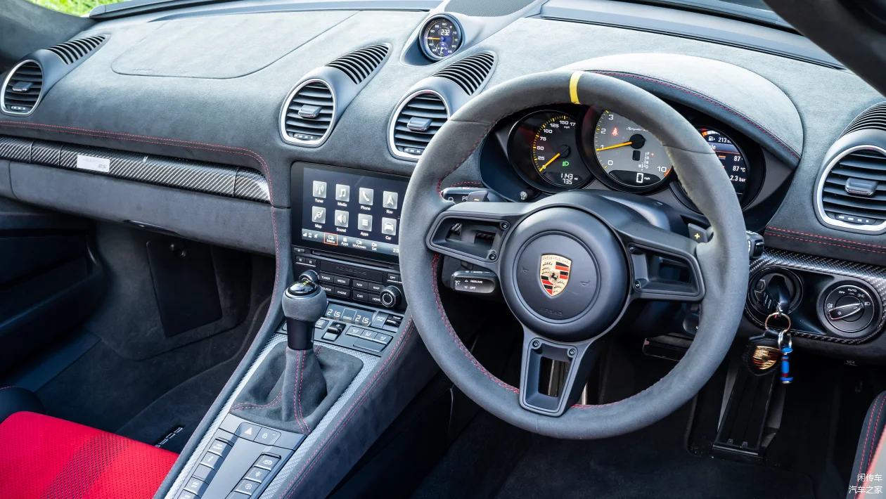 在内饰方面,新车当然不会和普通版没有太大的区别,依旧是标准的718设计,传统的机械仪表盘,小尺寸的嵌入式屏幕,圆形的空调出风口,中控台面上的石英钟等元素,都不会变化,当然作为性能版本,大面积翻毛皮面板覆盖,精致的机械式档把,战斗化的一体式赛车座椅,车门处的拉环装饰等元素,都不会缺席,时刻刺激驾驶者的运动神经。头枕处还镶嵌有专属的RS刺绣态度,提升了仪式感。