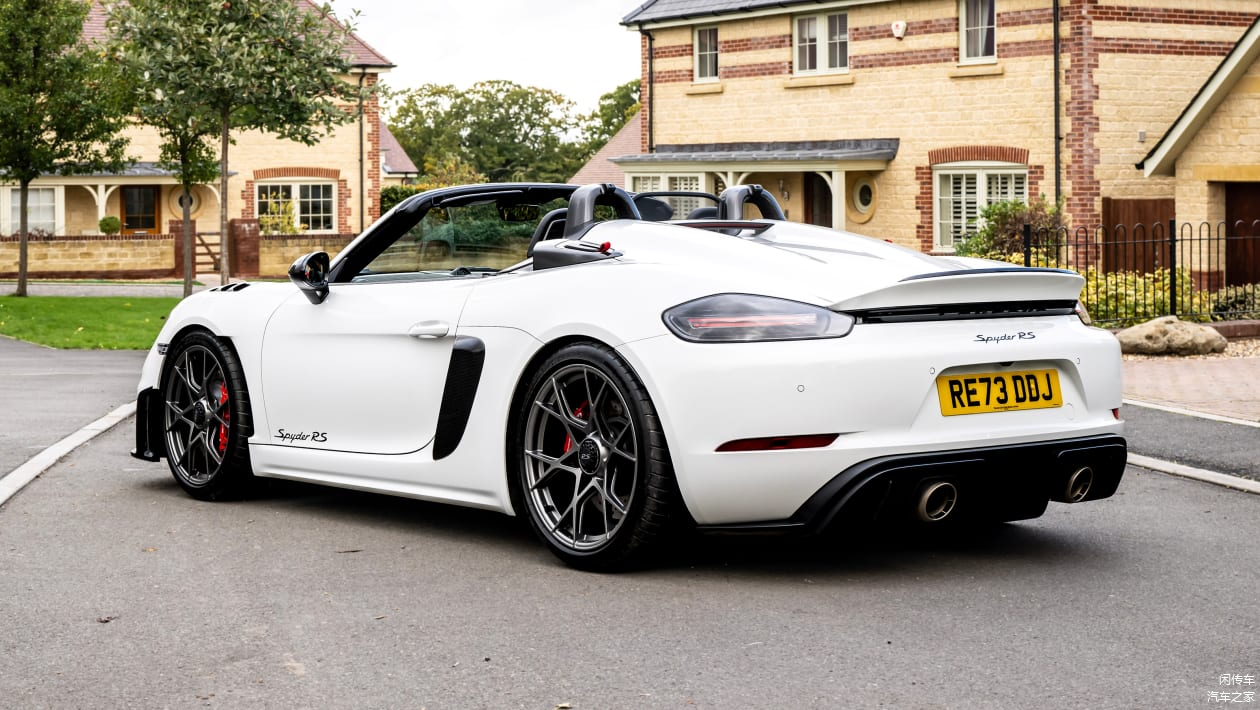 车身侧面既然是Spyder车型,有着独特的敞篷结构,并非机械式软顶设计,而是纯手动敞篷布局,仪式感十足,但同时又略显麻烦,散发出特有的魅力,当然作为一款性能版718车型,后轮前方有着夸张的进气道装饰加入黑色翼片进行补充,车门下方Spyder RS标志,彰显了车型的身份。