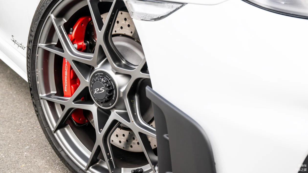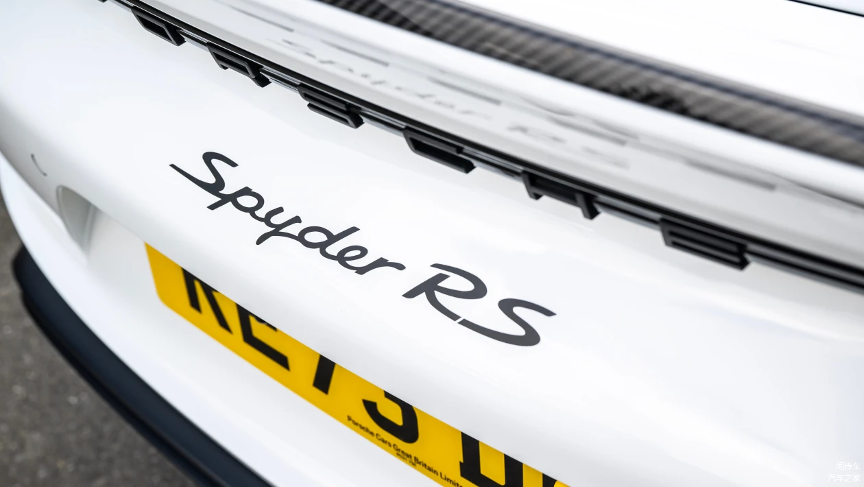 在车尾部分,座椅后方防管架引出了特殊的扰流板和独特的双隆起布局,同样是Spyder车型的象征。尾箱盖末端翘起的小鸭尾和黑色小尾翼形成双层设计,进一步增强了运动感,贯穿式的黑色结构镶嵌有保时捷车标,下方则是Spyder RS字母,再度强化了身份感。两侧的灯组没有变化,后保险杠部分偏中置的大尺寸双边双出,排气显示了强劲的动力。