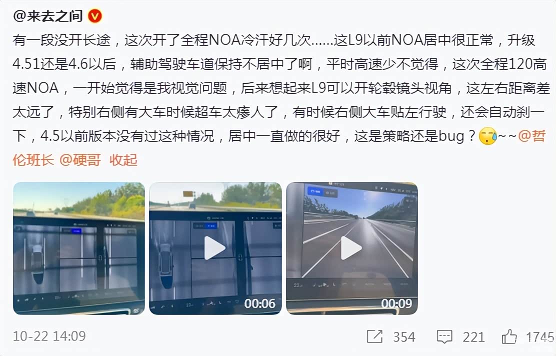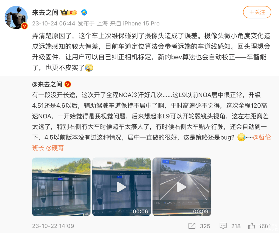 2023年10月23日,微博CEO王高飞(来去之间)表示,自己驾驶 理想L9(图片 | 参数 | 询价)在高速上出现了车道保持不居中的问题,产生这种误差的原因竟然是此前维修时碰到了摄像头。