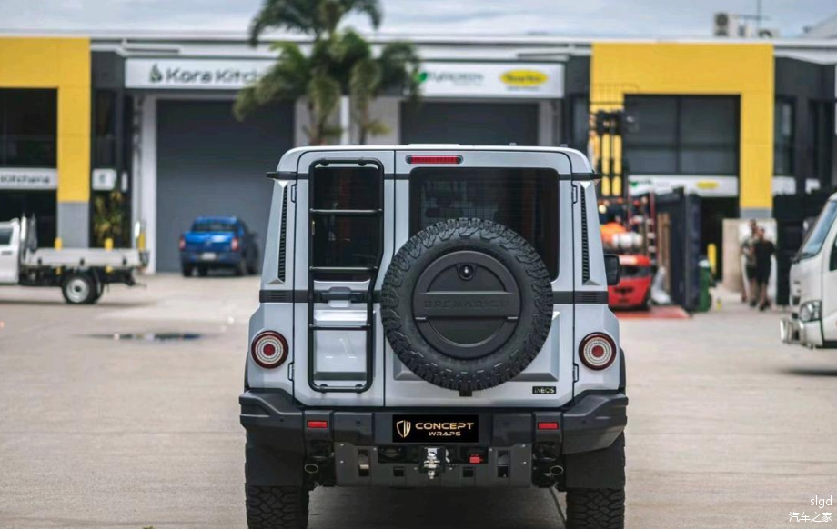 来到车尾,外挂式备胎依旧是我们熟悉的设计。其他部分与车头一样复杂,给人一种非常凌乱的感觉。车尾还增加了大量复古元素,包括尾部增加了一只小爬梯的设计,两侧带有双炮眼式大灯。与不同,它的后包围完全做了简化。总体而言,英力士掷弹兵算是路虎卫士的复古版,特别是在细节表现上堪称完美。