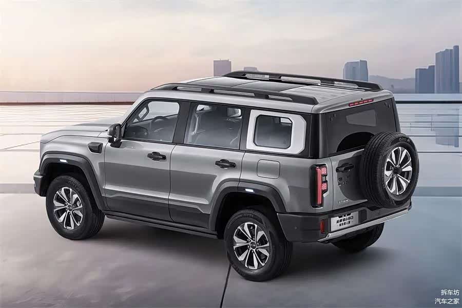 车身侧面,较为粗壮的黑色轮眉与车门下部的黑色护板贯通衔接,较大的轮拱设计也使整车的硬派风格得到良好展现。新车的尾部造型同样十分硬朗,纵向排列的尾灯组采用不规则造型处理。同时,新车采用外挂备胎、两段式平开尾门,具备很强的实用性,也符合大家对硬派越野车的认知。