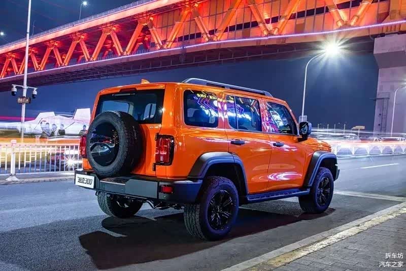 再看坦克300,外观的方盒子造型已经被大众熟知。除了前脸造型差异外,新车车身侧面的黑色轮眉、外挂备胎与平开尾门等设计与BJ40一样,审美在线且符合预期。