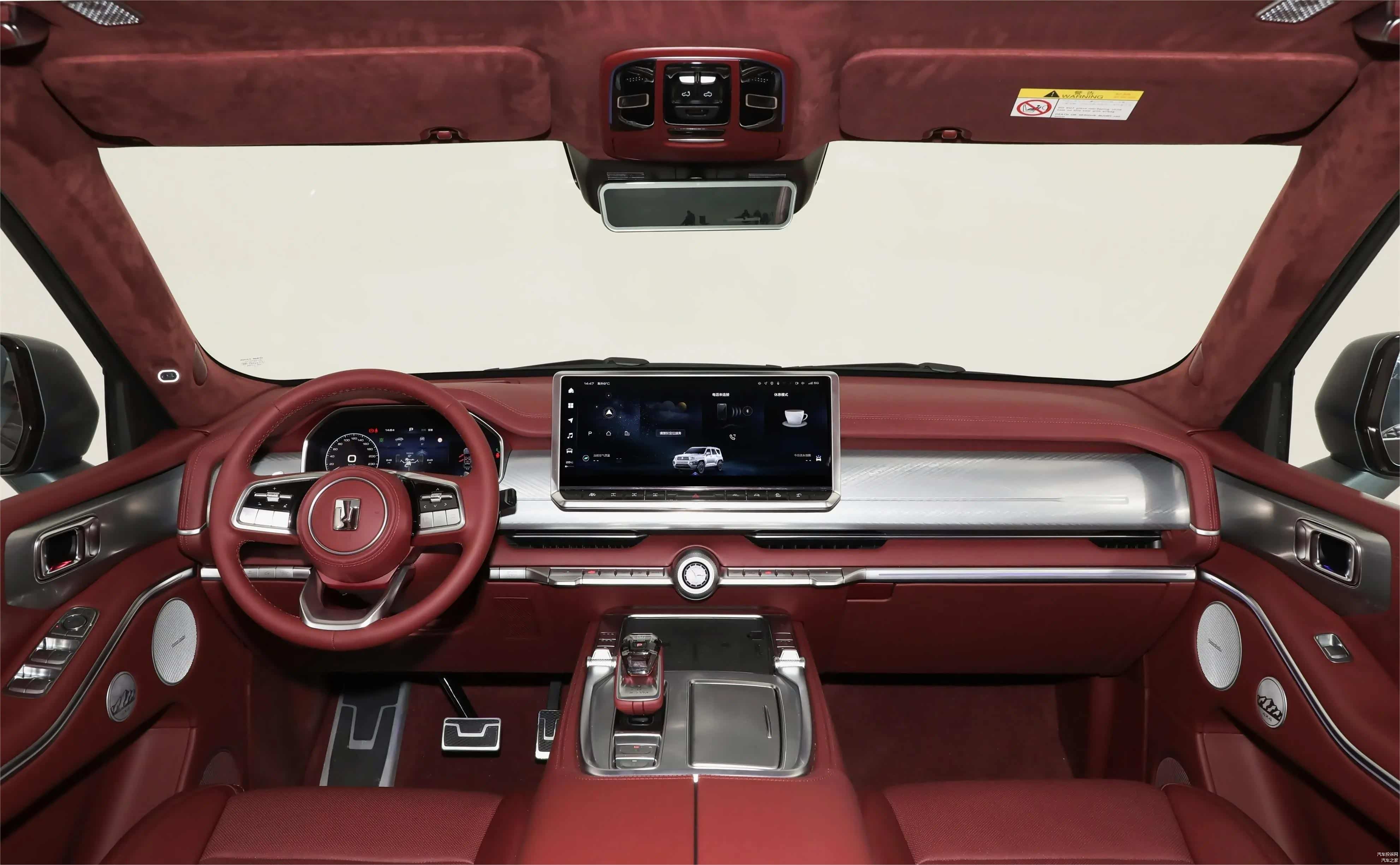 坦克700 Hi4-T的内饰与首发限定版基本保持一致,采用暗红色材质,并配备了银色铝制饰板。车辆搭载了悬浮式中控大屏和全液晶仪表盘,下方还配置有两排实体按键。副仪表台区域前方设有两个最大功率50瓦的手机无线充电面板,并且提供拨杆来切换驾驶模式以及调整空气悬架高度。此次预售版本将星空顶改为可开启的电动天窗。