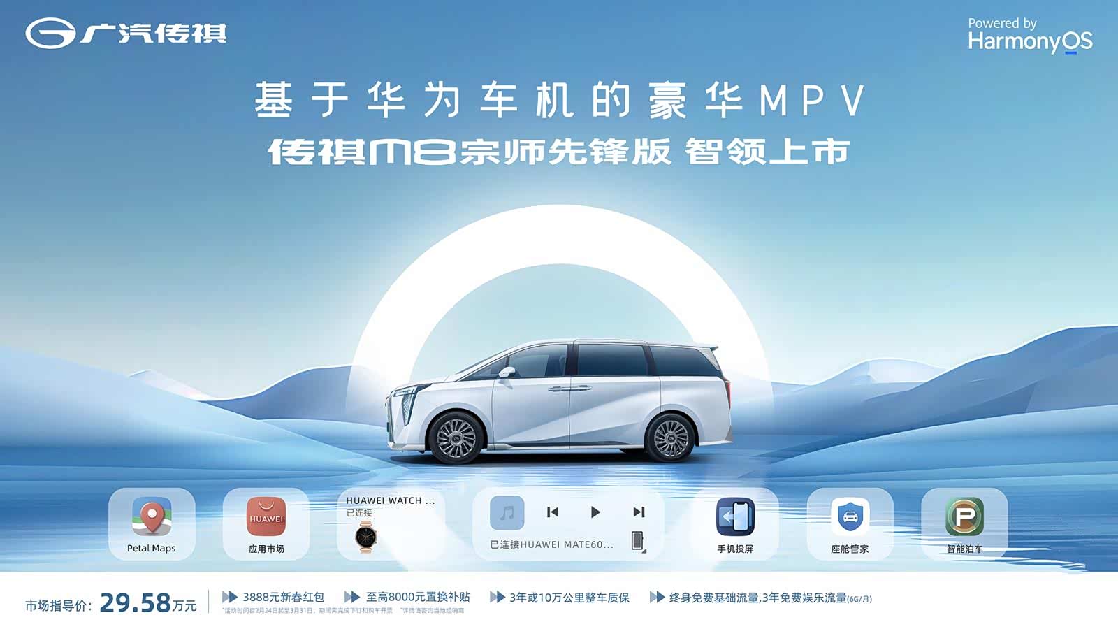 北京时间2024年2月24日,广汽传祺官方宣布旗下传祺M8宗师先锋版正式上市。新车共推出1款车型,售价为29.58万元,并推出了购车四重礼。