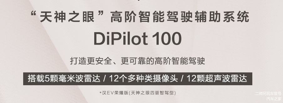 除此之外,汉EV荣耀版还成为比亚迪首个搭载“天神之眼”DiPilot 100平台的车型,在智能驾驶辅助方面有更好的表现,可以进一步升级高速和城市快速路的NOA领航辅助。