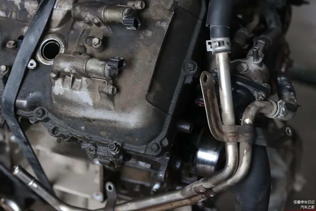 瞧瞧发动机状态,外表全是油泥,漏的有些年头了。