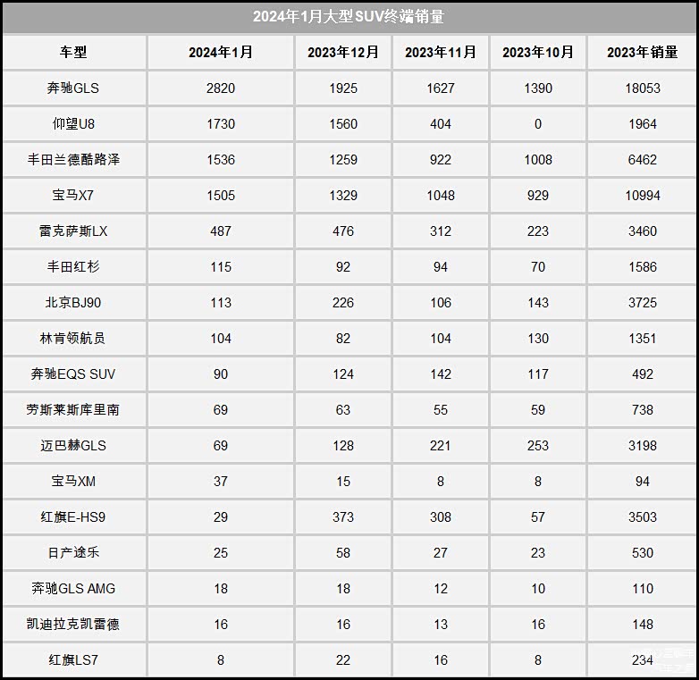 中高端大型SUV市场是一个可选车型较少的细分市场。虽然可选车型较少,但它们之间的竞争也非常激烈,奔驰GLS依靠较强的品牌号召力,在销量方面力压老对手宝马X7,来自比亚迪的仰望U8是这个细分市场的黑马。