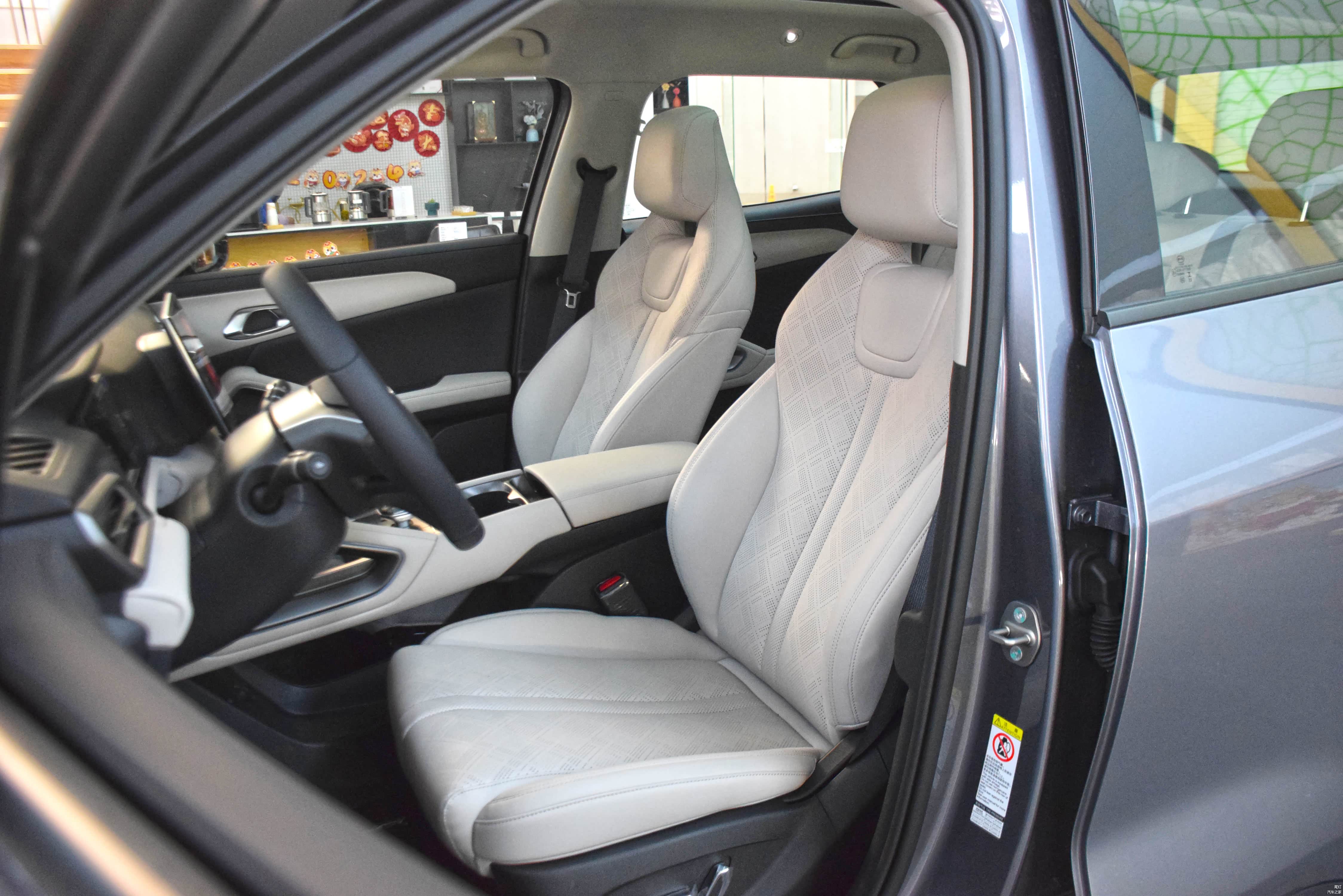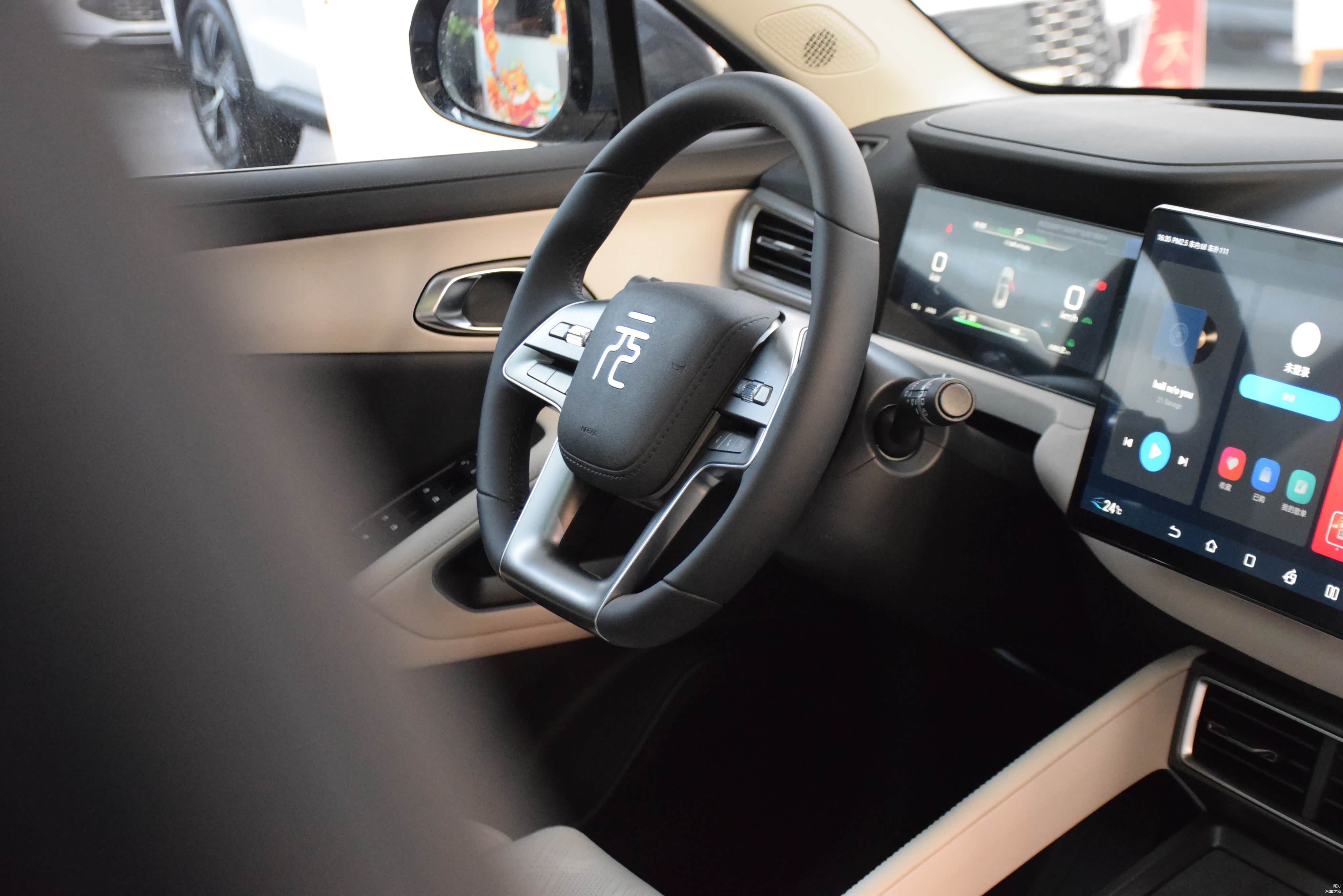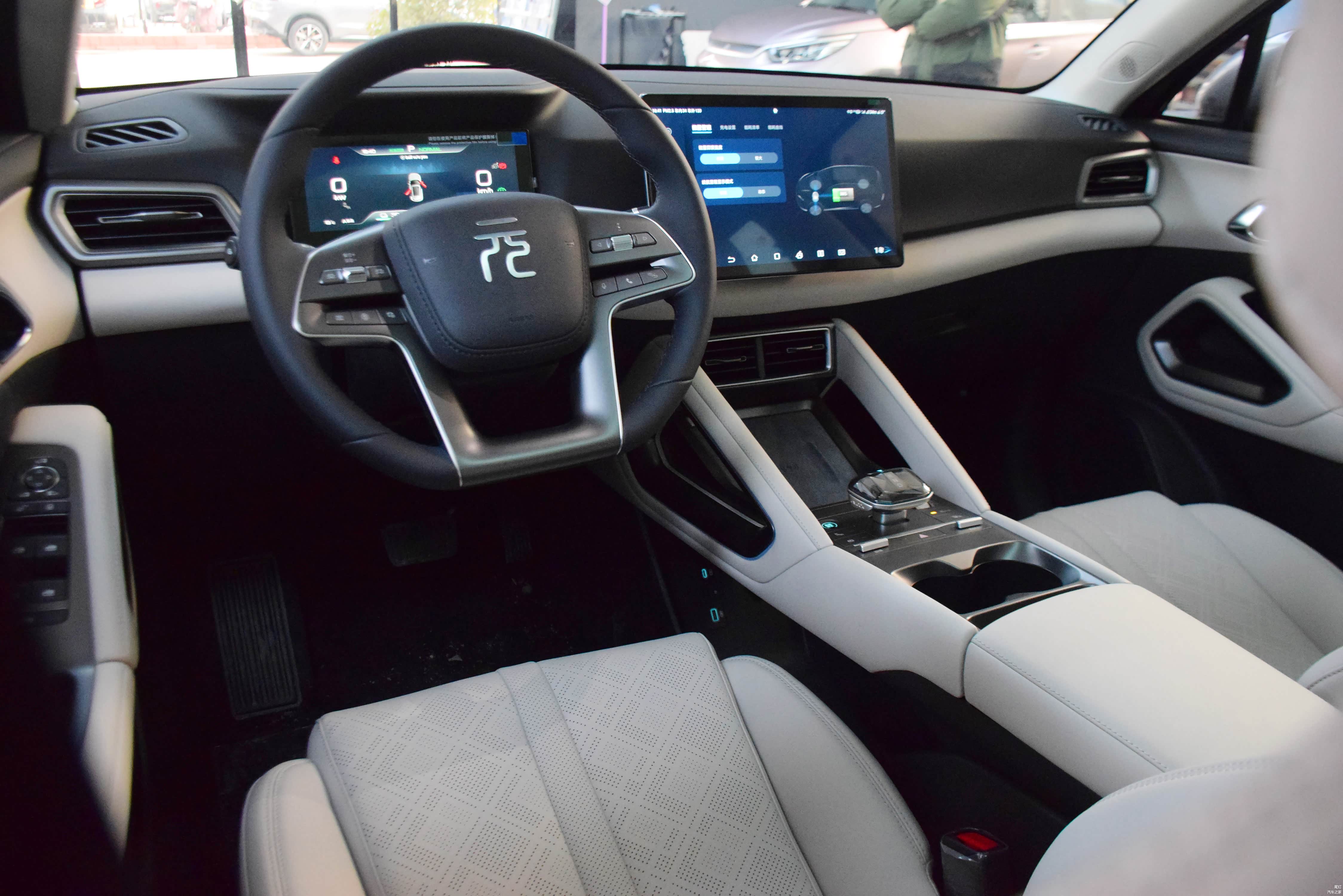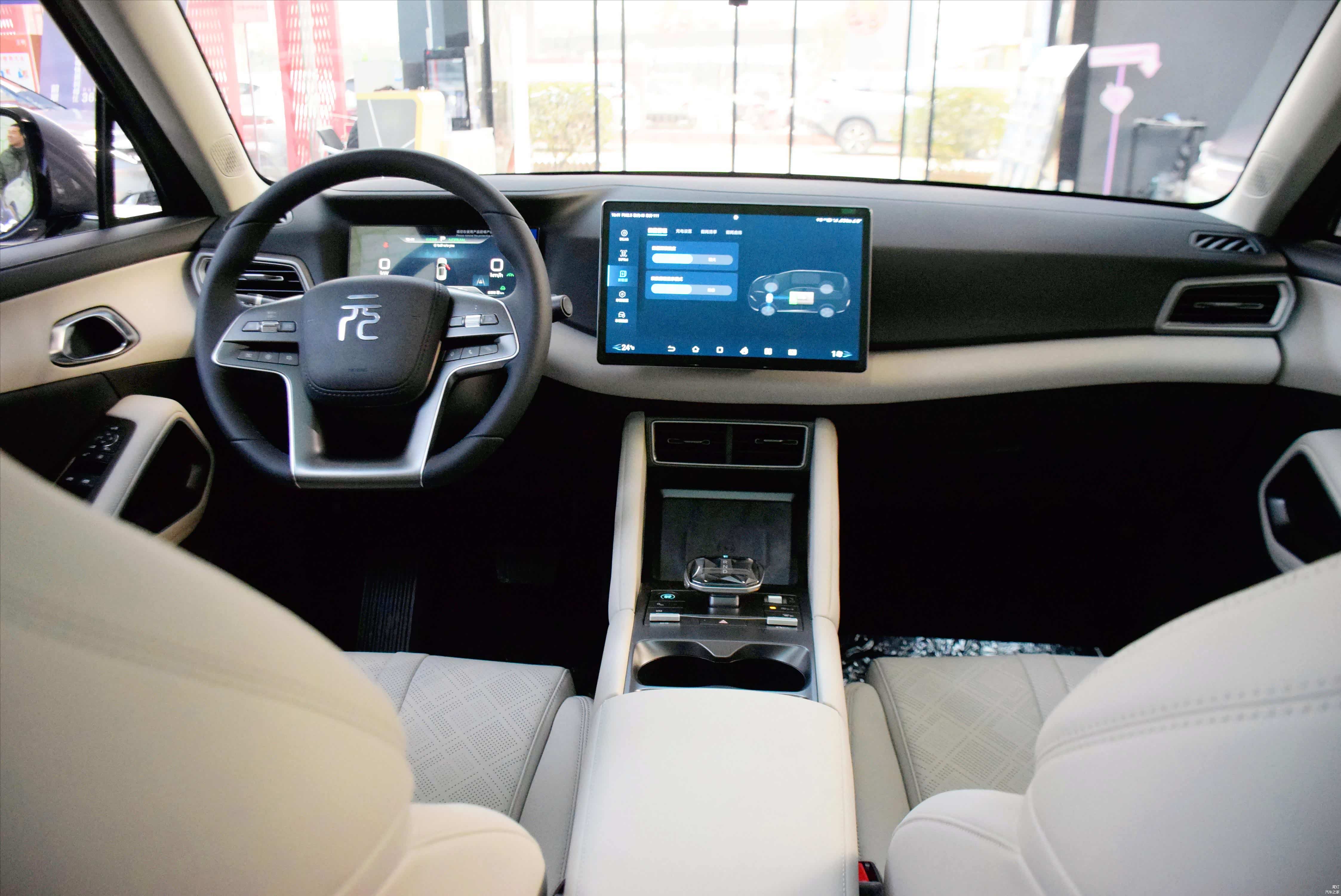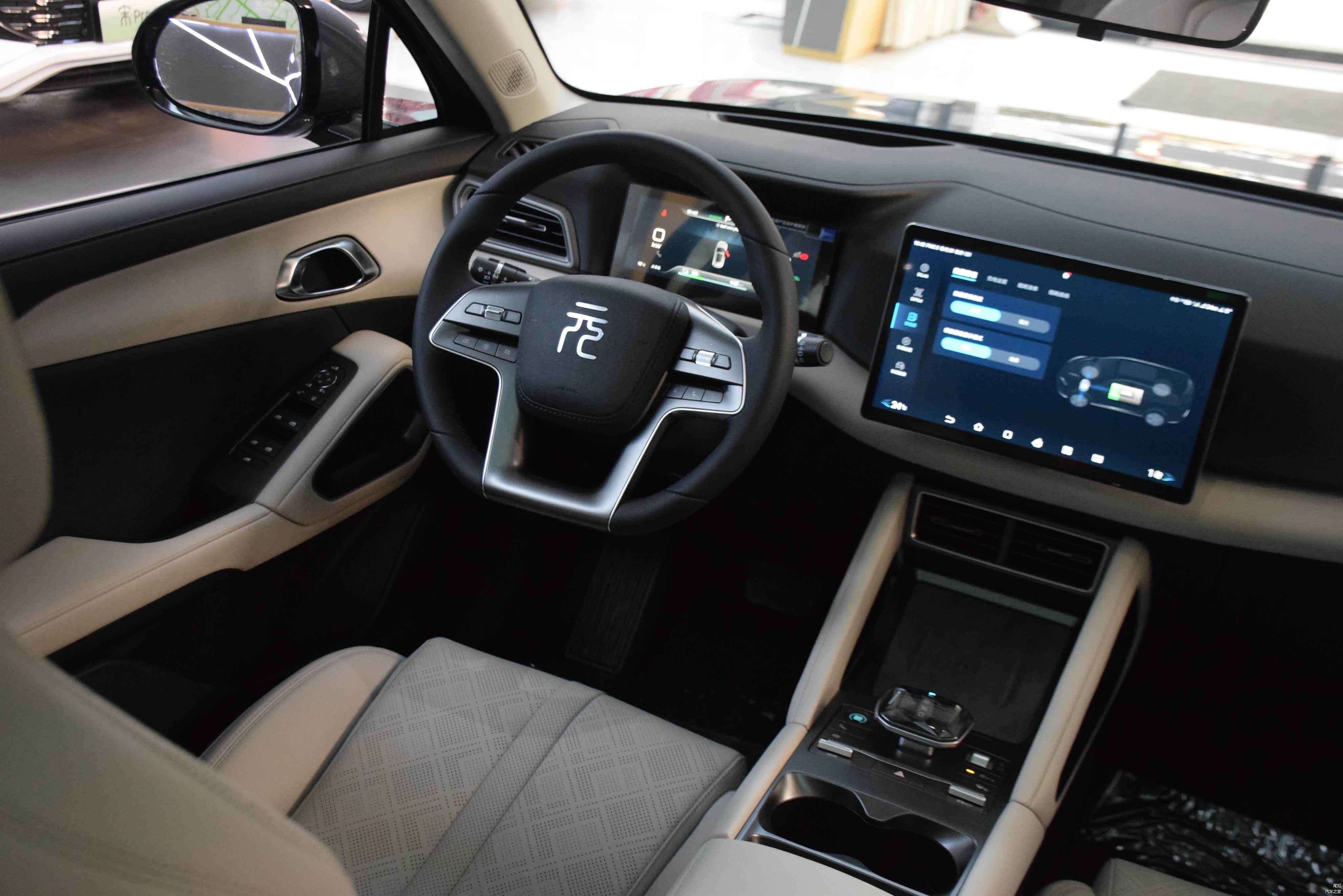 进入车内,元UP全新的内饰映入眼帘,多功能方向盘、8.8英寸液晶仪表盘以及12.8英寸中控触屏营造出不错的氛围感。