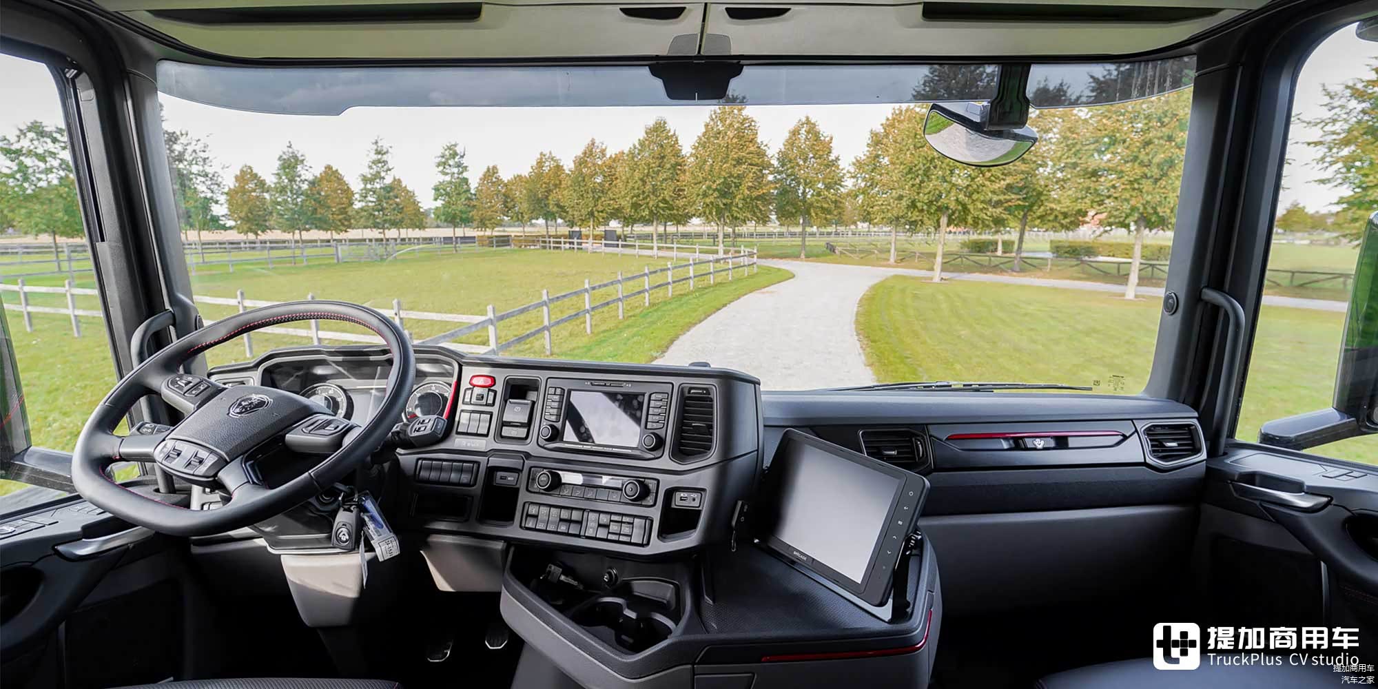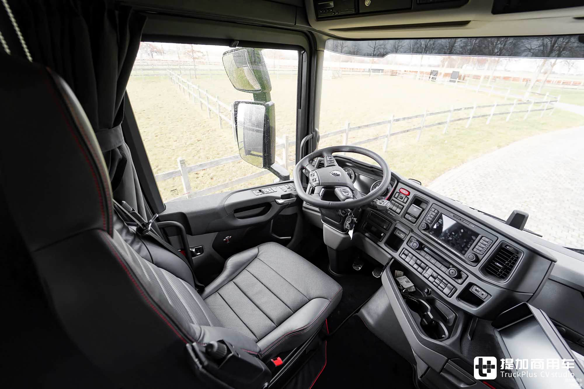 看完车外的种种配置,接下来就让我们进入车内。先从驾驶室开始看起:车辆延续了斯堪尼亚NTG代车型的驾驶组件,包括多功能方向盘、环抱式仪表台、液晶+机械混合仪表盘等等。作为一台高配车型,车辆搭载了电子手刹系统,同时还带有自适应巡航等电子系统,使驾乘体验更加轻松。