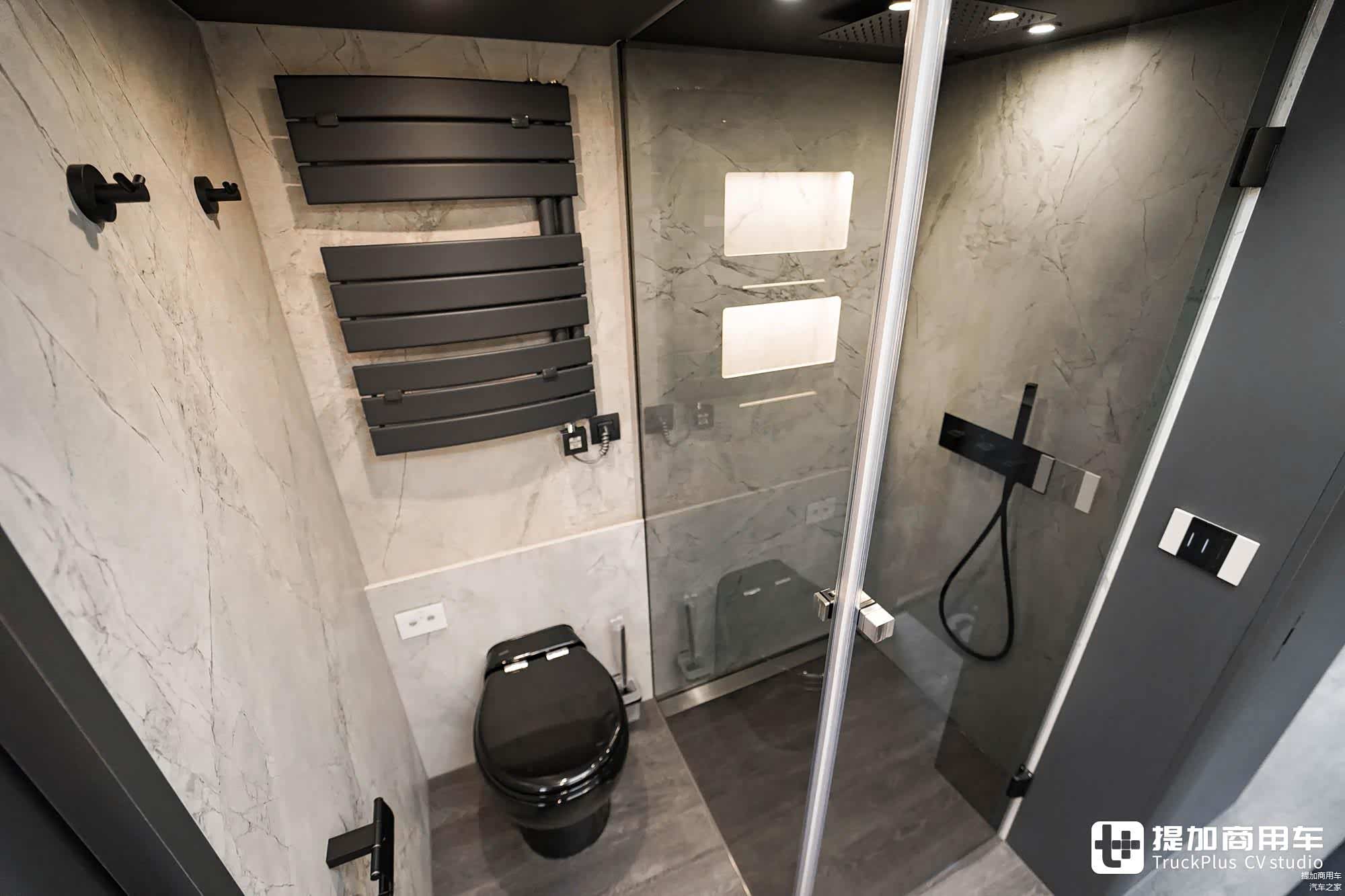 洗手间位于车身中部,也就是入口门的对向区域。采用“三分离”结构,配备淋浴系统、电热毛巾架、马桶等配置。