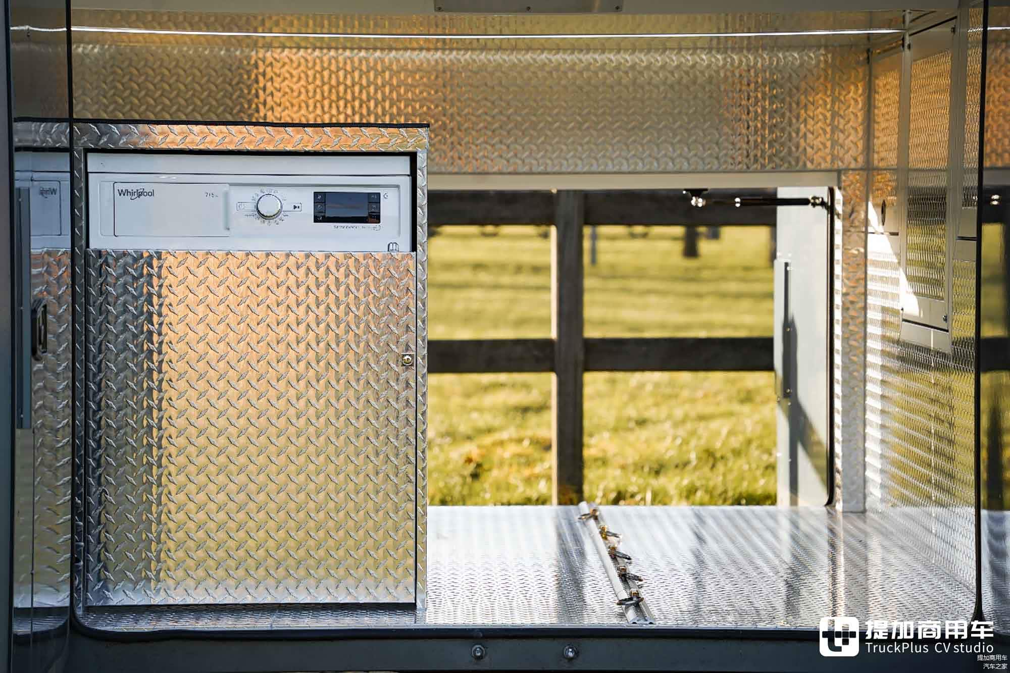 储物舱内部还安装了一台洗衣机,穿脏的运动装备可直接在此处洗净,无需将脏污带入车内,同时将震动和噪声隔绝在生活区外。