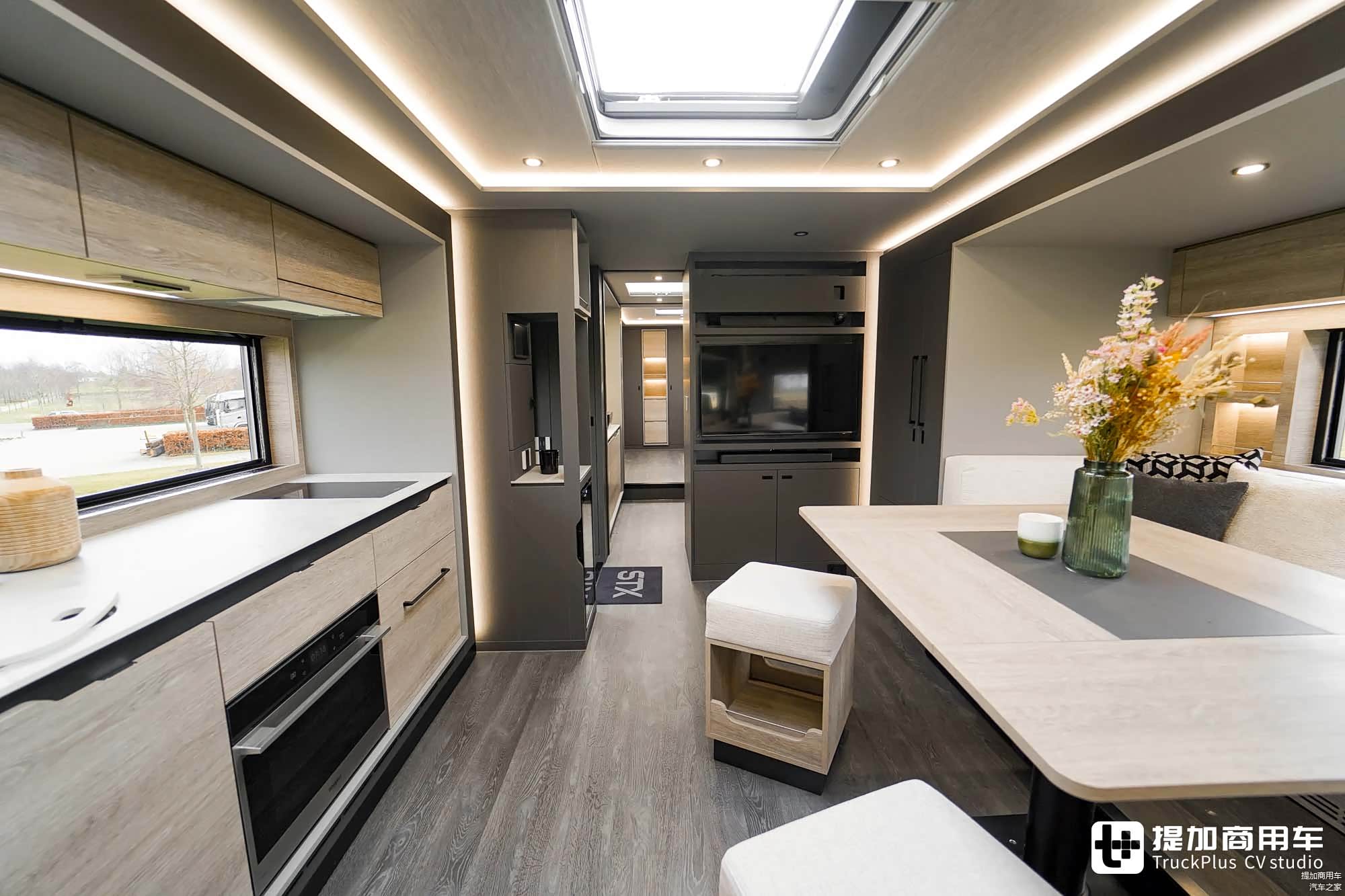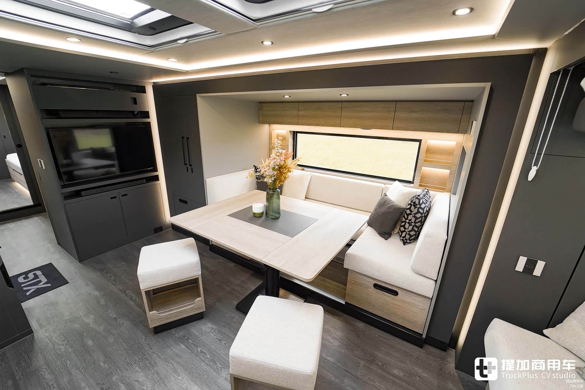 作为一台豪华A型房车,车内空间自然得到位。STX为这台斯堪尼亚590 S房车匹配了3台大尺寸滑移拓展舱,一台位于车身右侧,两台位于车身左侧。同时,车身右侧还配备了车外照明灯及大尺寸的房车遮阳帘,可将车外变为额外的活动区域。