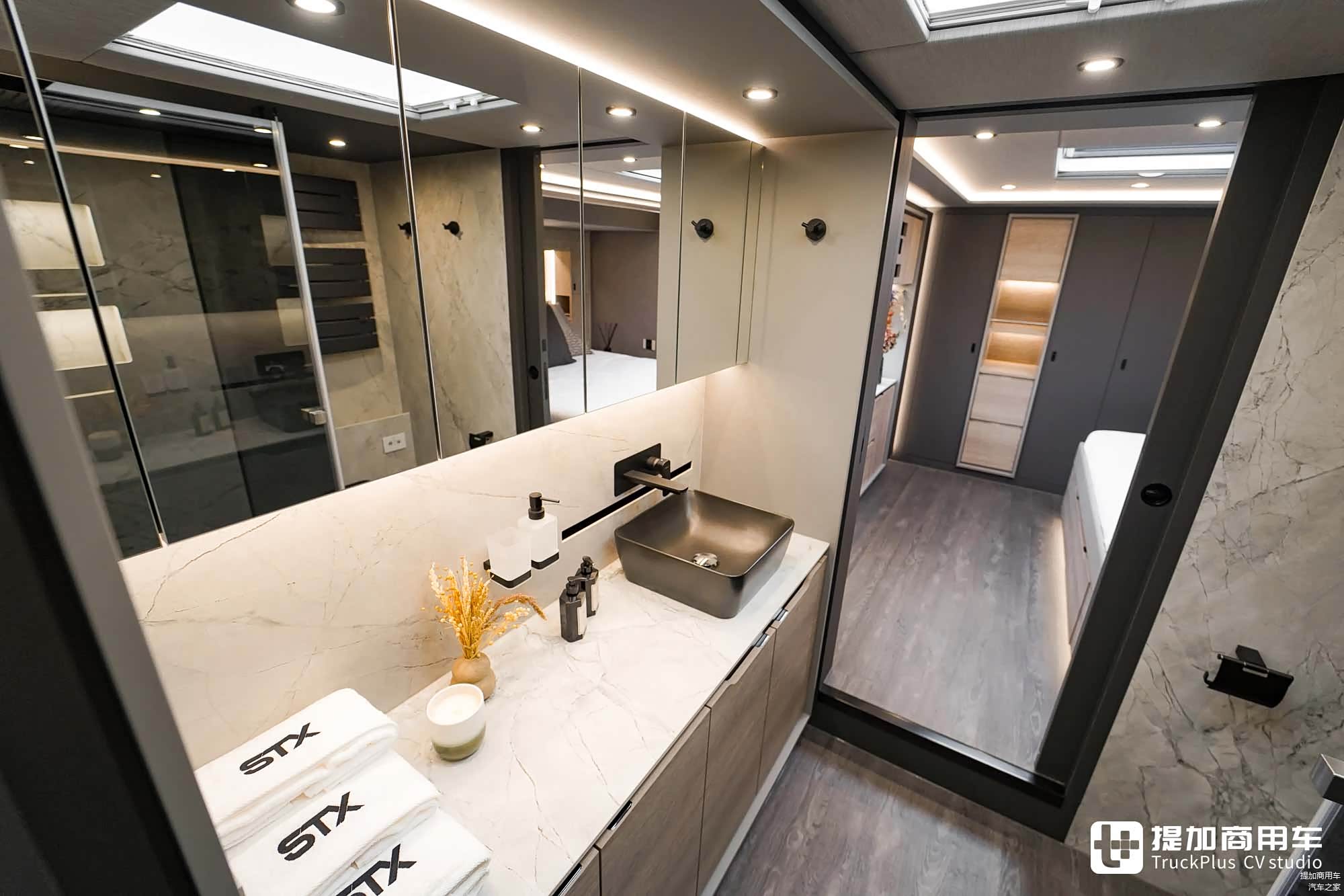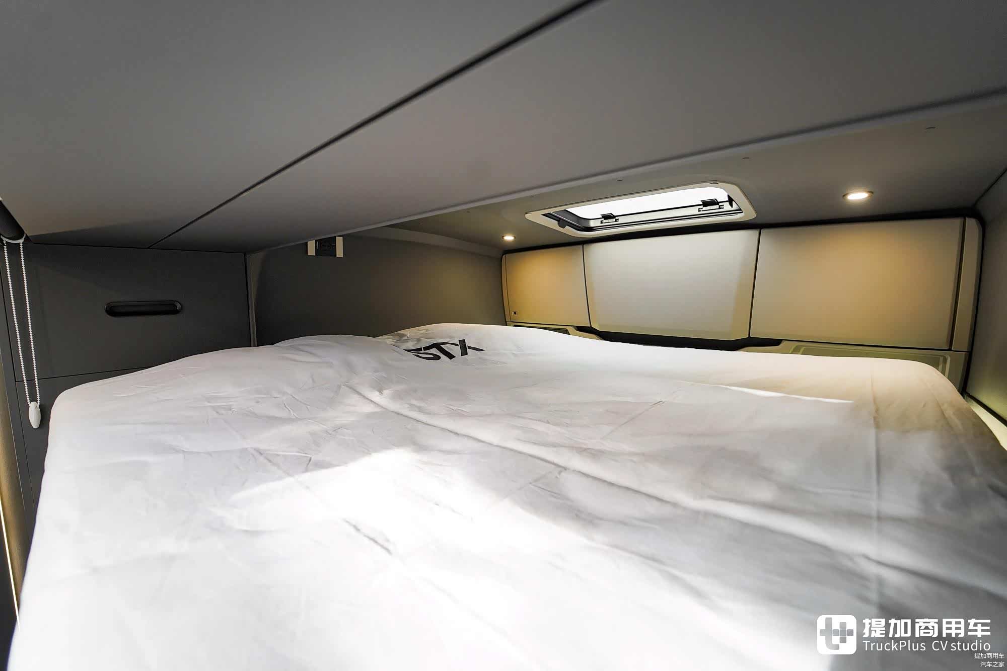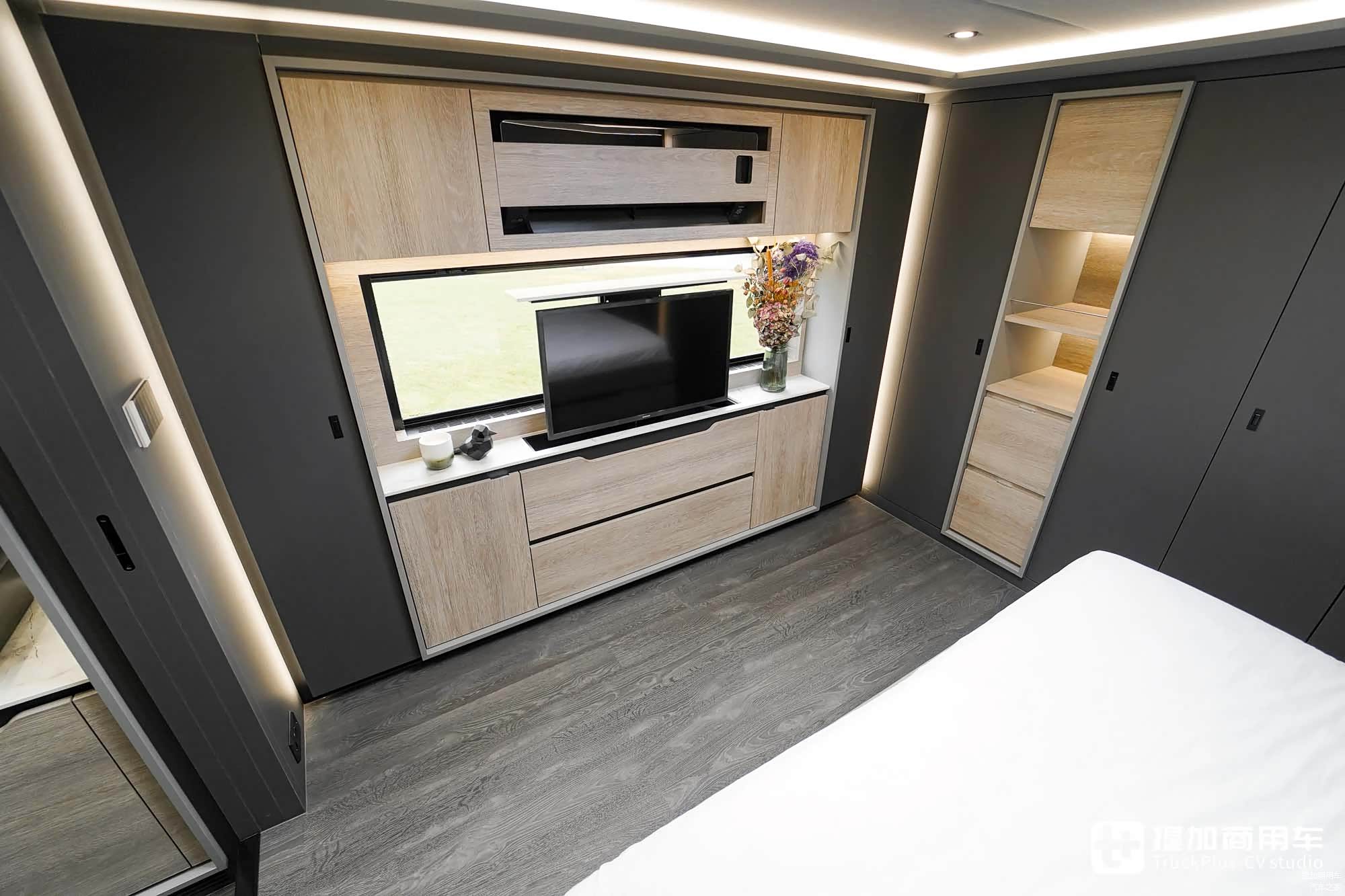 车尾是独立的主卧区域,这里是车主专属的私人生活空间,设计有天窗、大床、衣柜等配置,采用两道隔断门与会客区隔离。同时,这里更远离发动机及发电机等设备,免于受各类噪音影响。