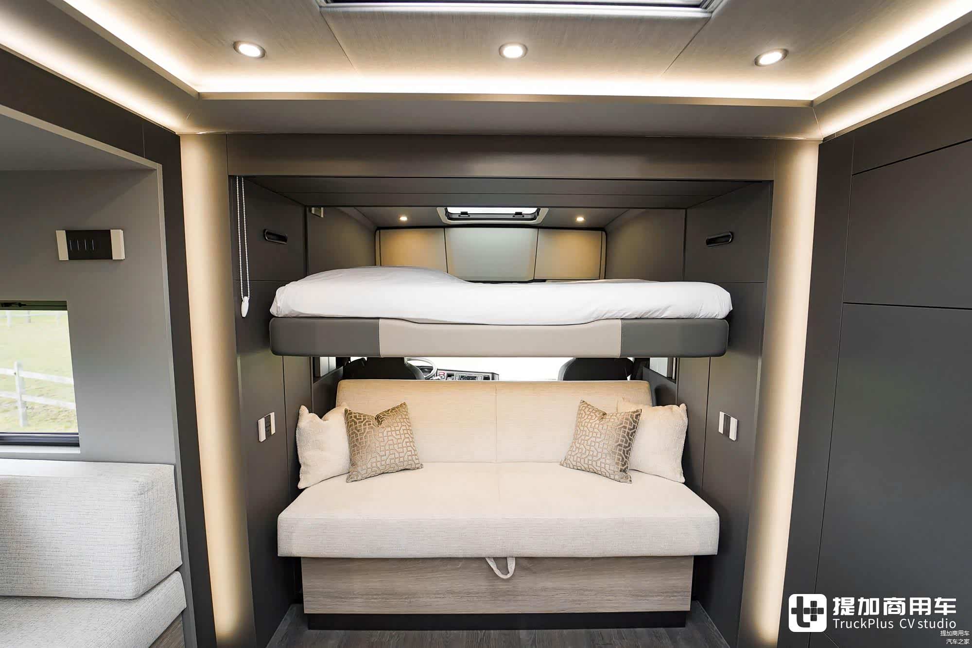 驾驶室后壁进行了切割改造,与房车箱体融为一体。这种设计的好处在于:带来了更宽敞、更灵活的车内空间。因此,在保留驾驶室储物柜的同时,车辆还在驾驶室顶部安装了一台电动升降床,宽度达到了1.6米。