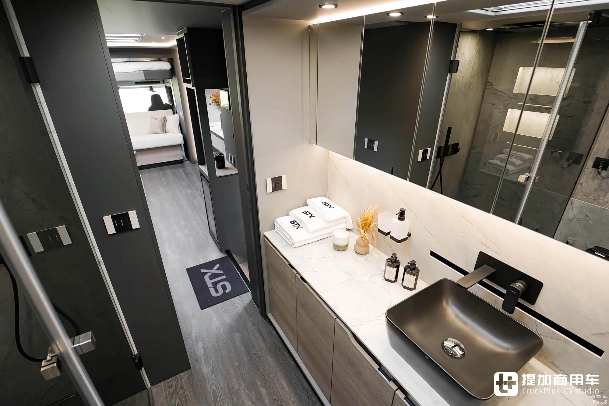 生活区域的箱体整体位于车架之上,带来一块平坦的贯通式生活空间。为了增强前后连通性,STX公司对车辆的驾驶室进行了爆改,后端切割、轮廓改造,从而将驾驶室与生活区合而为一。生活区地板下方是各类设备,例如配电柜、蓄电池、水箱等等。它们挂在车架侧面,便于维护,同时与生活区进行了隔离。