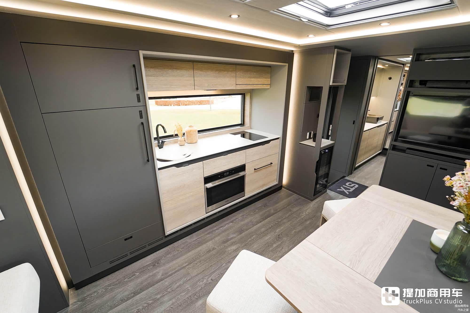会客区对面为厨房区,配备水槽、电磁炉、蒸烤箱等配置。冰箱采用嵌入式布局,隐藏在厨房区前方的橱柜内,维护车内设计的整体性。