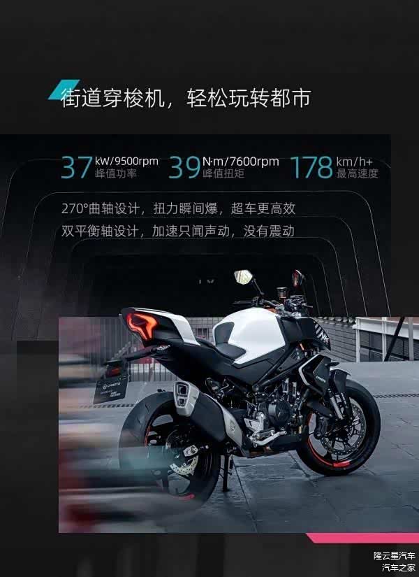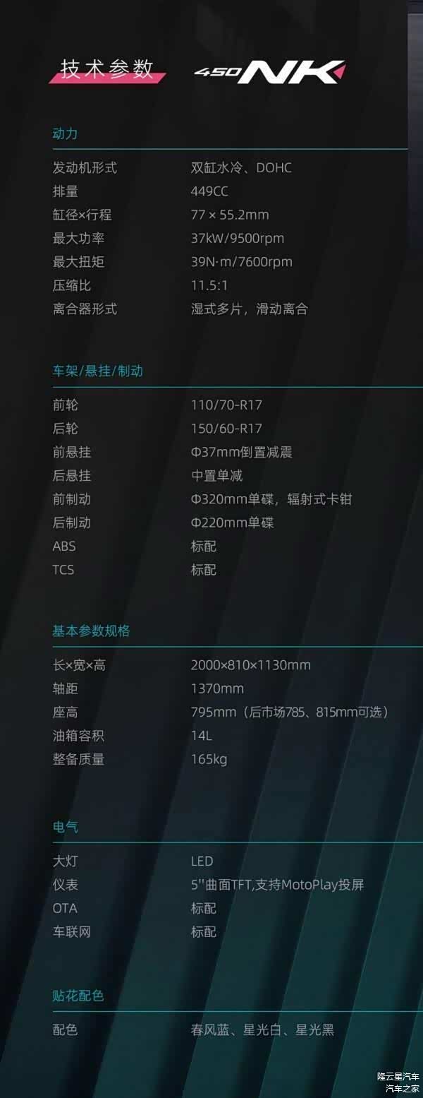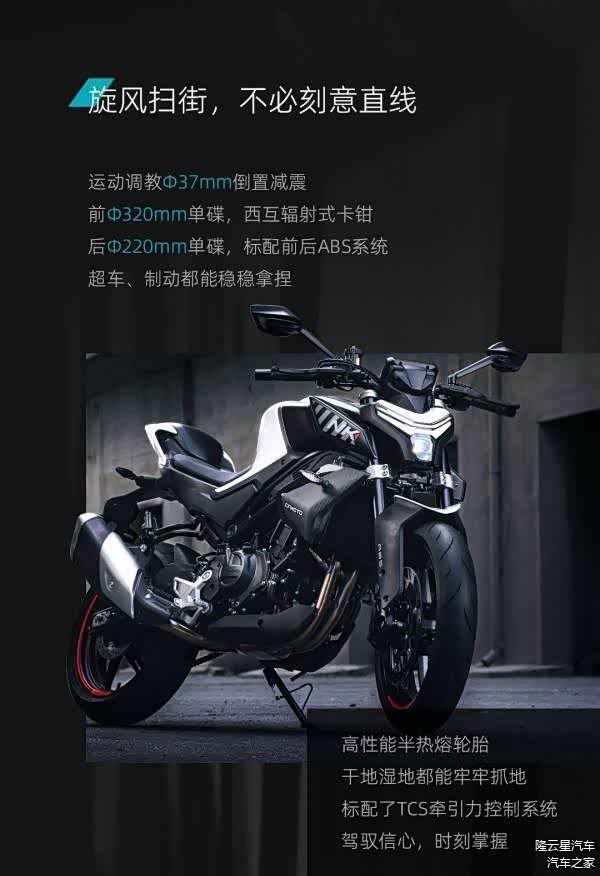 制动方面采用西互卡钳,减震采用倒置前叉加后中置避震,前后17寸轮毂配备了双通道ABS加TCS组合,还有450SR同款支持导航投屏的5寸TFT曲面仪表,全车LED灯源也为标配。