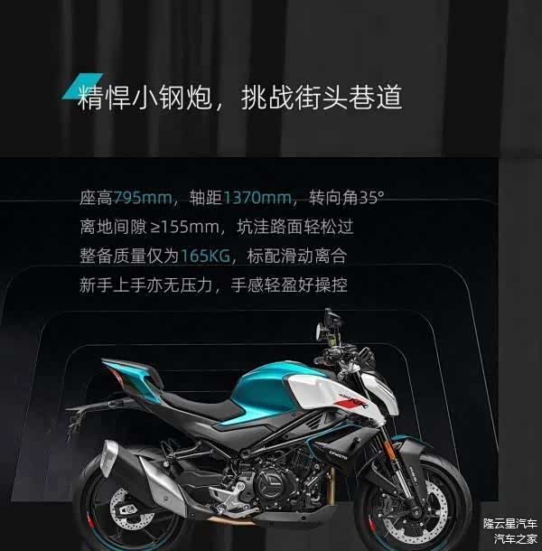 动力上搭载450SR同款引擎,最大功率37千瓦,最大扭矩39牛米,整备质量165公斤,标配滑动离合油箱容量14升,795毫米的座高对于新手也比较友好。