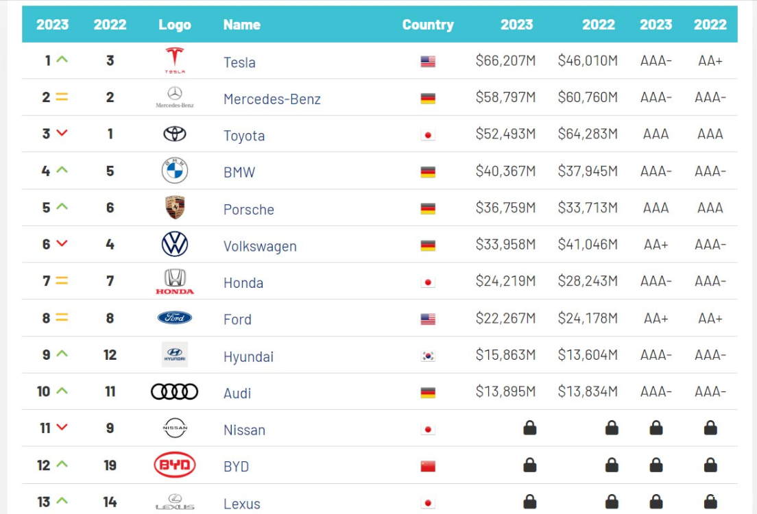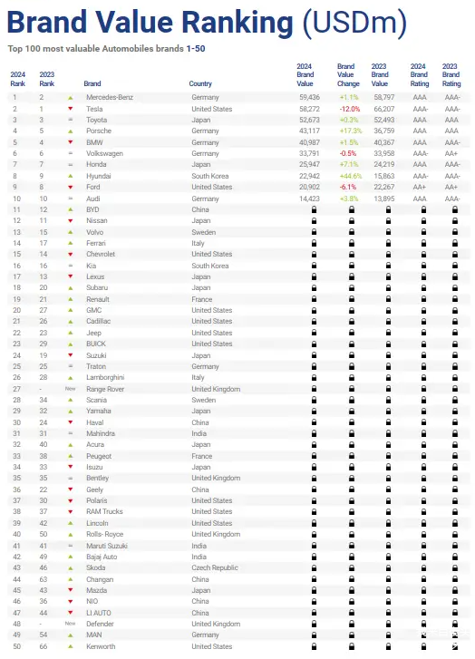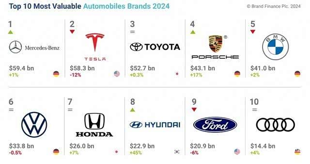 根据Brand Finance以各厂商的市值来进行计算和排名的2024年度全球最有价值汽车品牌100强榜单,今年梅赛德斯奔驰以594.36亿美元打败去年的榜首特斯拉,成功从去年的第二名晋级到市值第一的宝座,而特斯拉今年以582.72亿美元遗憾排名第二,至于全球新车销量最高的丰田则是以526.73亿美元的市值排在第三。