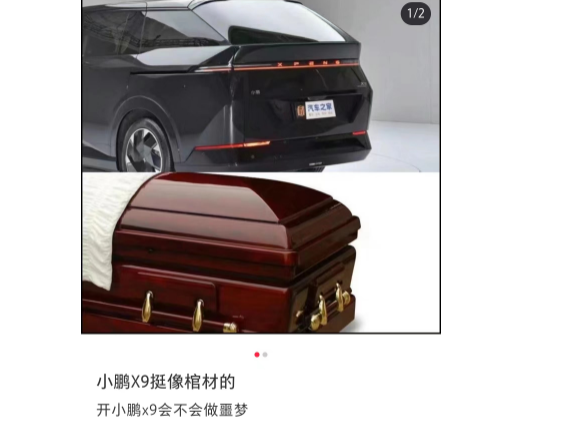 3月7日,一张关于 小鹏X9(图片 | 参数 | 询价)的图片突然在流传开来。这张图片中,仅截取了一辆黑色小鹏X9的尾部,而在图中与之作对比的是一个黑色棺材。而如果在网上搜索一下,类似的图片不少,有些还直接配文“小鹏X9挺像棺材的,开小鹏x9会不会做噩梦”。而如果细看发布时间,基本集中在这两天之中。