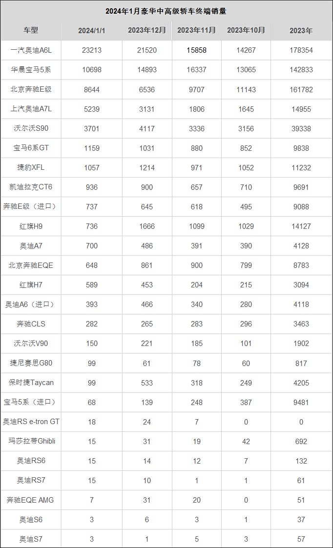 终端销量数据显示,一汽奥迪A6L是2024年1月豪华中大型轿车市场的赢家,月销量23213辆,品牌认可度不低且终端优惠大是它的核心卖点。上汽奥迪A7L在1月迎来销量大幅增长,售出5239辆,超越了沃尔沃S90、凯迪拉克CT6等二线豪华品牌中大型轿车。对于奥迪A7L而言,当其终端优惠增加且销售服务店越来越多之后,销量获得提升也就合情合理,这也是当初一汽奥迪经销商抵触上汽奥迪的根本原因,因为市场份额会被分走。进口A7、进口A6的1月销量为700辆、393辆,市场走势也比较稳定。高端车型方面,RS6、RS7的1月销量同为15辆,S6和S7同为3辆。